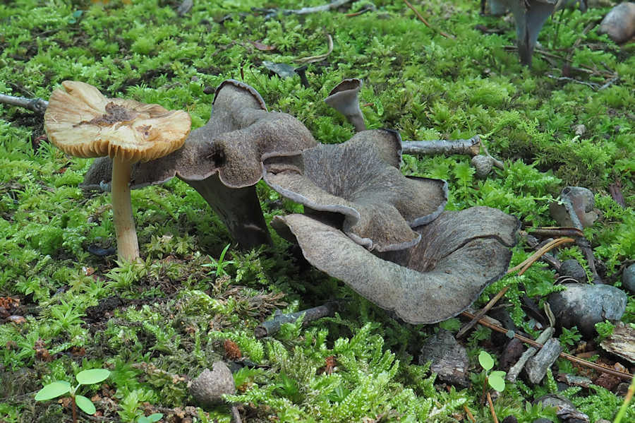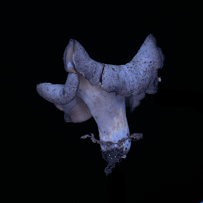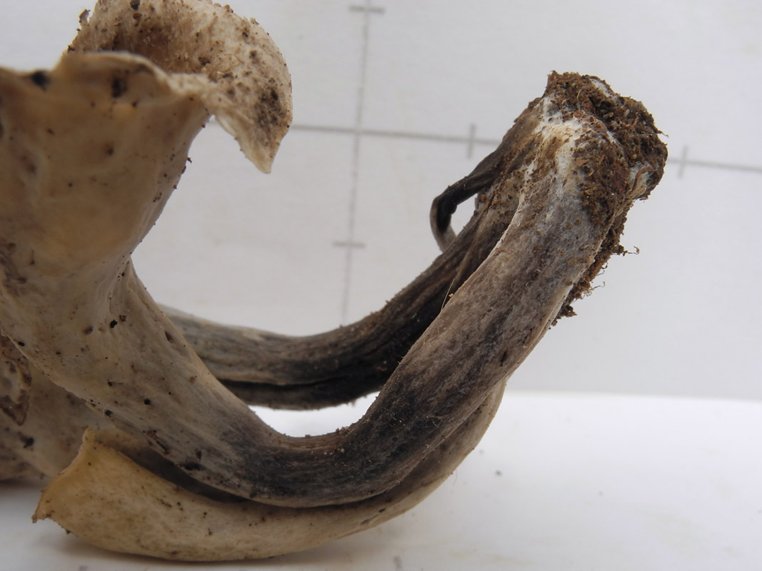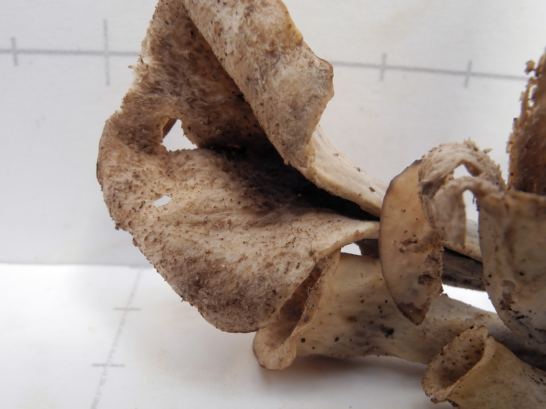 子実層は外側下面 灰白色−淡灰紫色 ほとんど平滑−低いしわおびる 柄の根元まで垂生することがある