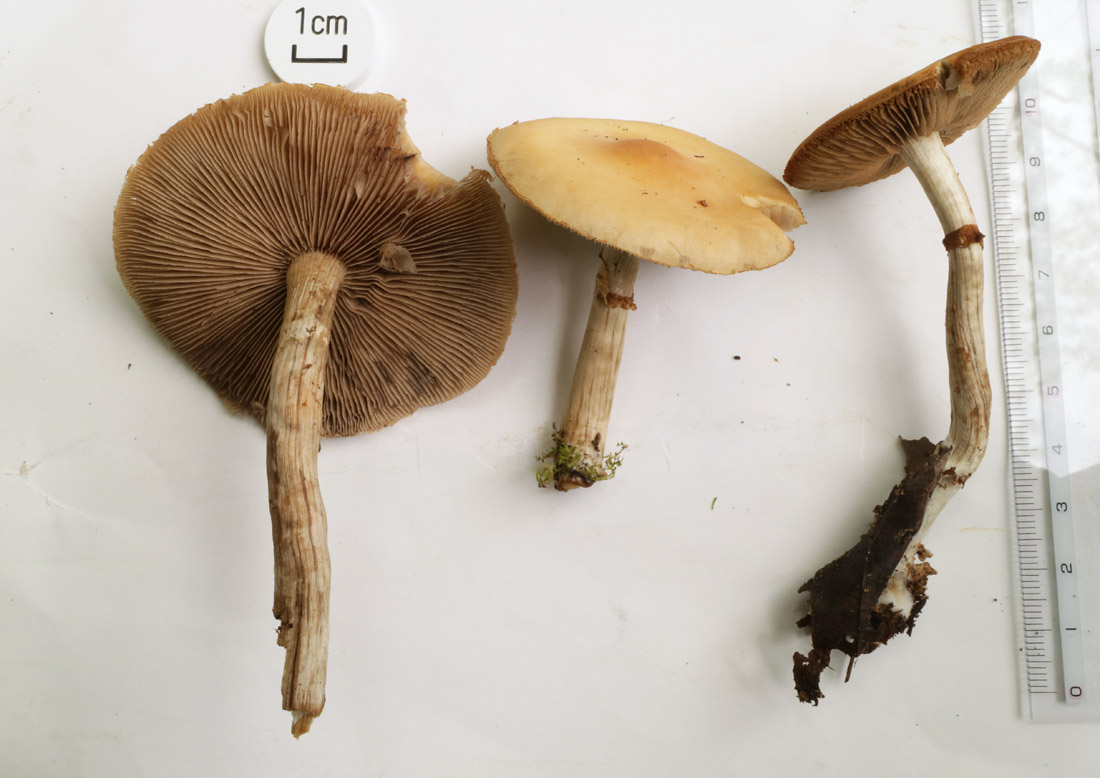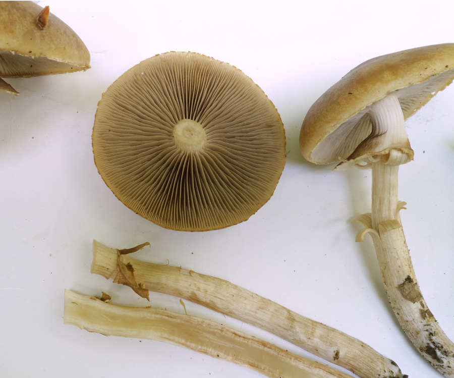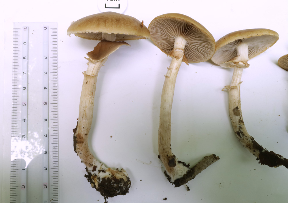 3.0-10.0p前後×3-9-12mm前後 上下同幅で基部やや膨らむ 淡黄土色だが白色の微細繊維におおわれる つばは白色だが胞子の落下により暗褐色の条線状となる つばは大型膜質 柄の上部にある 中空‥中実
