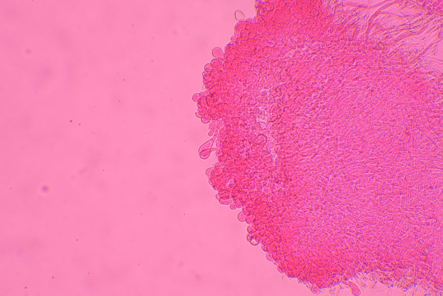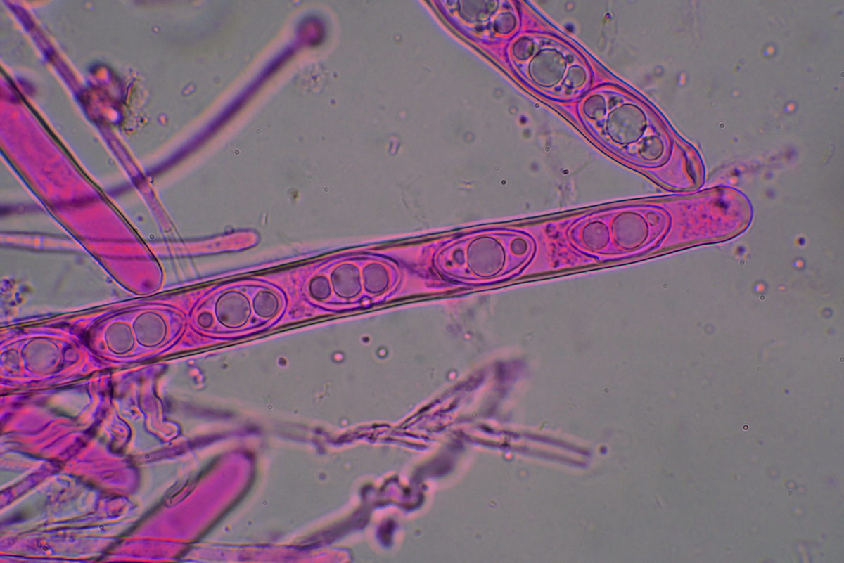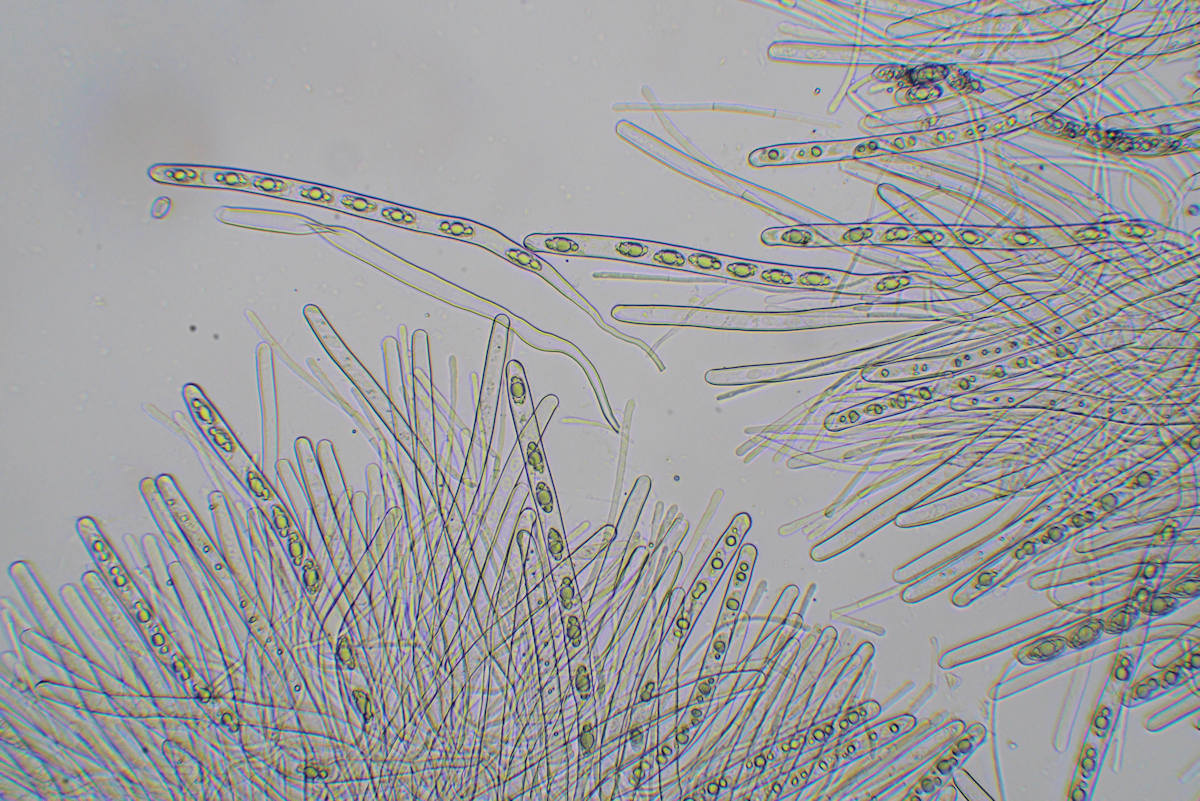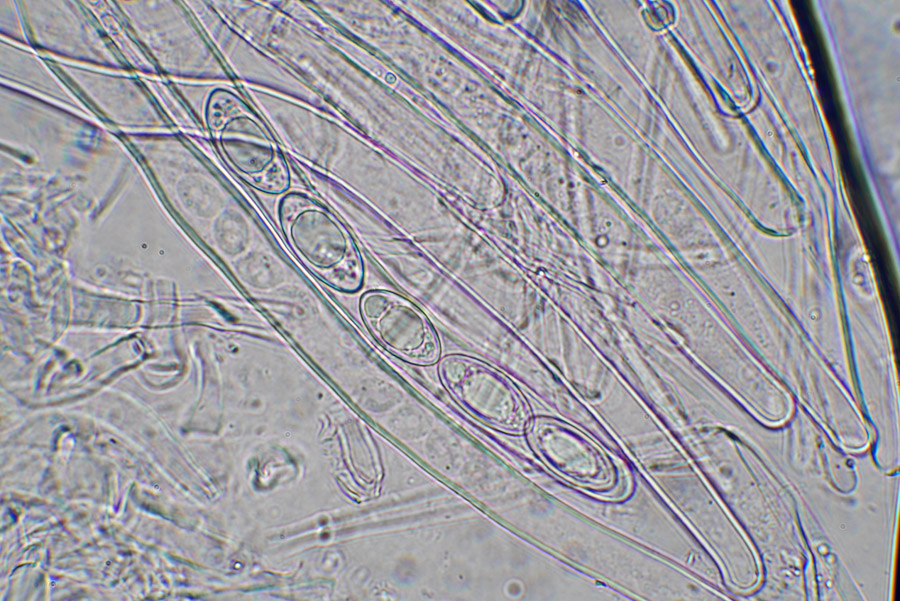 子嚢は円筒形で圧膜 8胞子を一列に生じる 胞子は楕円形−豆型 無色 3-4個の油球含む
