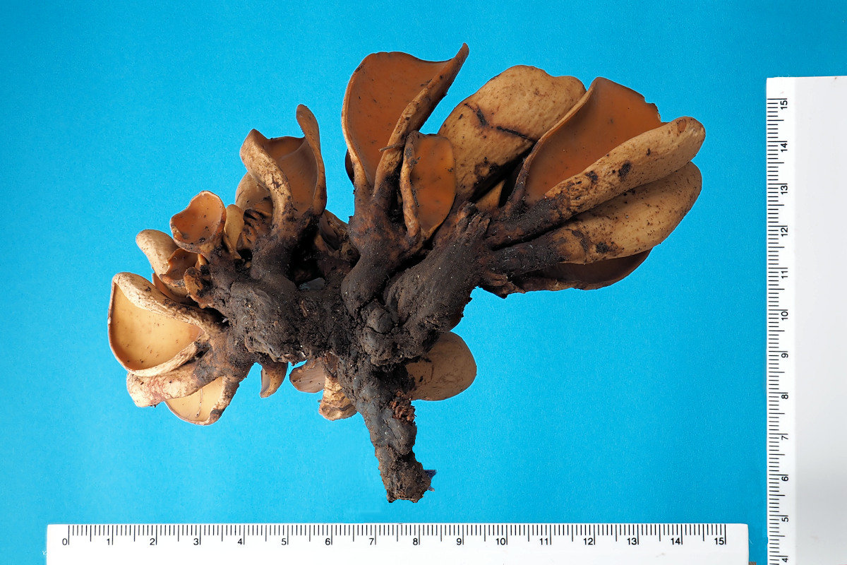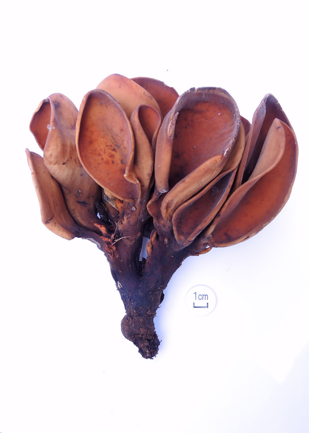 地中の菌核から15-20本の子嚢盤が房状に生じる 外面はほぼ平滑 丈夫な皮質 菌核はかりんとう状で黒褐色