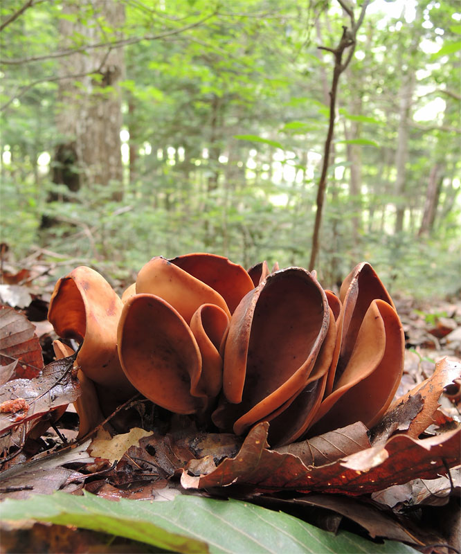 春〜秋に広葉樹主体の林内地上に発生する