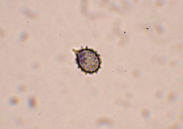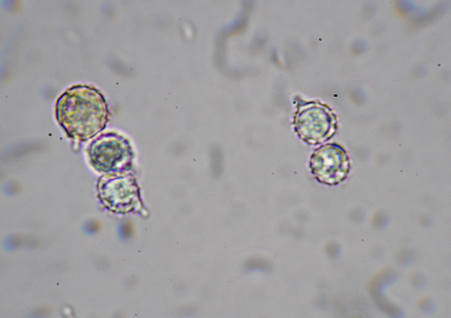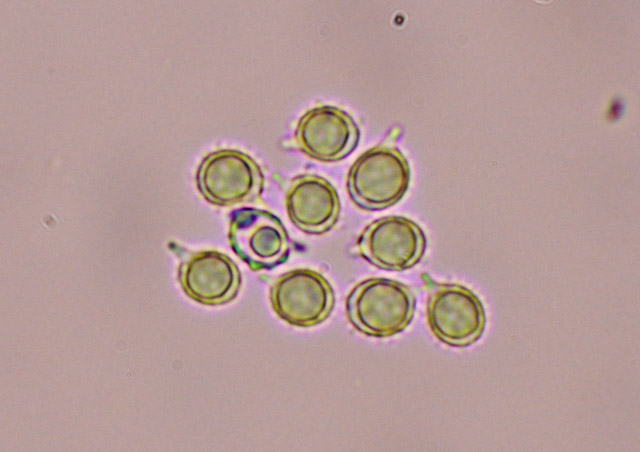 胞子はアミロイド 類球形 くちばし状突起を持ち、表面にトゲ状突起あり