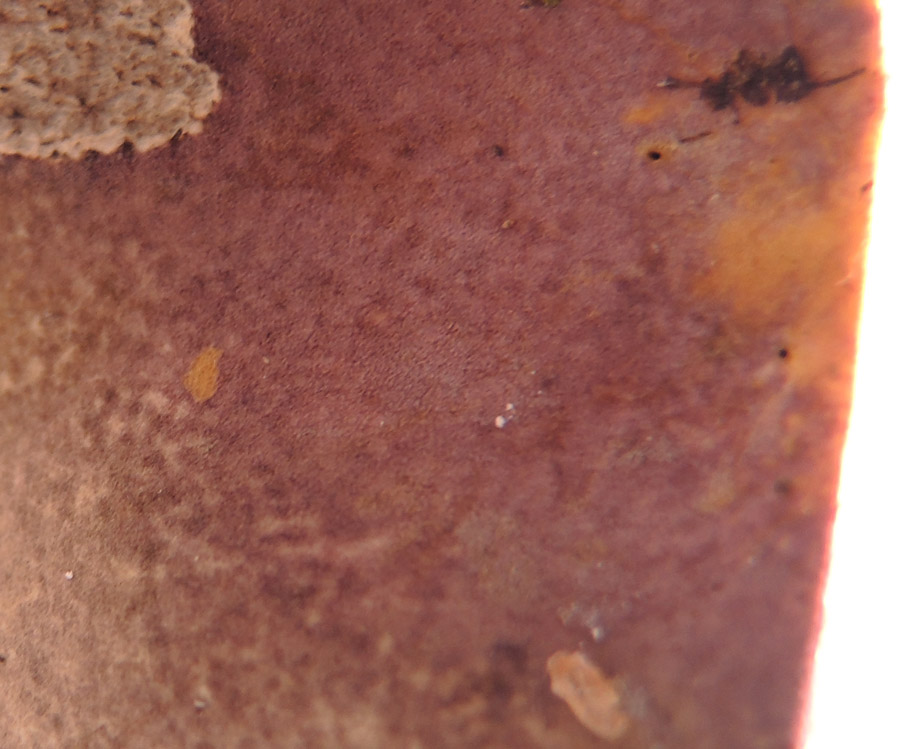 6.0-9.0cm 中央がくぼむまんじゅう形→中央くぼむ平→ろうと形 湿時粘性あり ほとん平滑−ざらつき感あり 粒状線無し 傘表面全体がくすんだ赤色−赤紫色−黄色−黄土色−淡緑黄色などが混じり複雑な色合いを表す