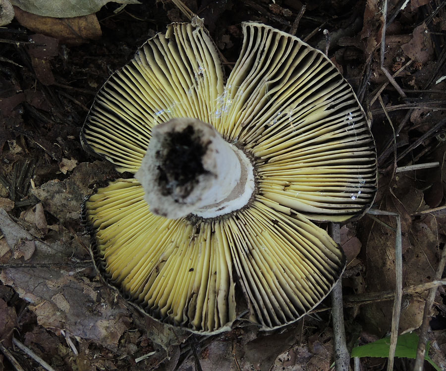 傘が赤色系で傷つくと赤変→黒変する種にイロガワリベニタケがある。イロガワリベニタケは傘が淡赤色で縁に粒状線あり、柄が白色である