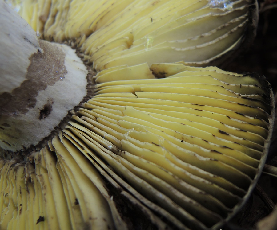 この種は古くなると全体が黒色になると思われる。また、若い子実体でも一見すると老菌あるいは傷んでいるような雰囲気がある