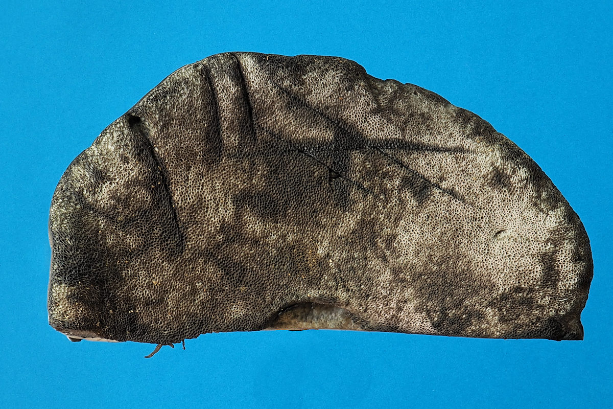 厚いやや堅い 淡帯緑黄色−灰白色 空気に触れると淡灰色−暗灰色変し−部分的に黒色変する 成熟すると柄基部でゼラチン化し帯褐黄色 特有の味、においなし
