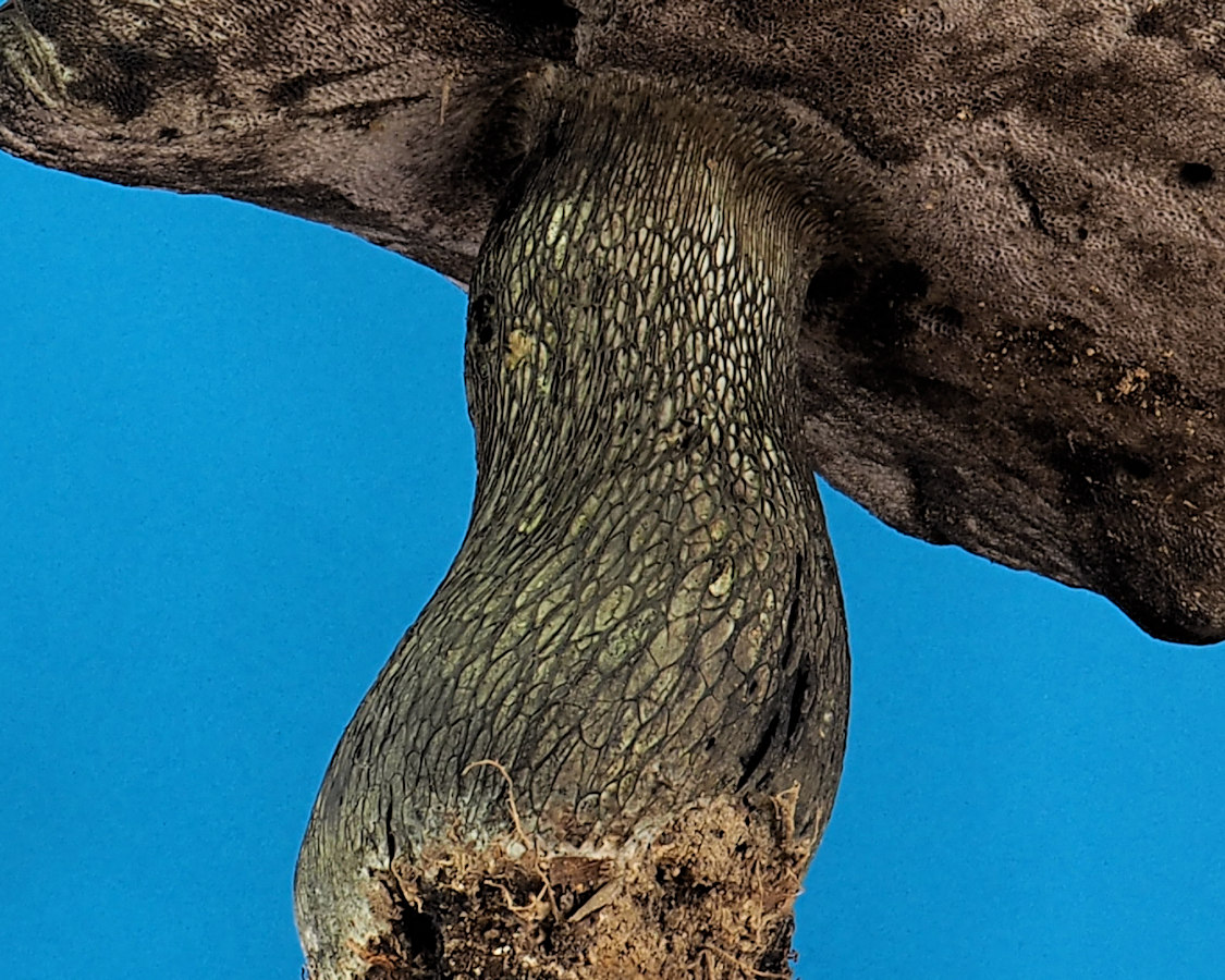 5.0-12.0cm×10-30mm 下方に向かい太まる 基部多少尖る 全体に明瞭な隆起した網目模様を生じる やや粉質 帯緑黄色−灰黄色−下部でやや暗色 基部でときに帯オリーブ黄色−帯褐黄色のしみ生じる 網目は初め地色と同色→黒色 擦ると黒色変する 成熟子実体はときに柄基部付近でゼラチン化する 中実