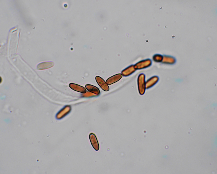 初め淡灰黄色−帯緑灰色→帯橙灰色−帯紫灰色 擦ったり傷つけると黒色変する 陥入しほぼ離生−上生 孔長7mm前後 孔口は管孔と同色 小型 類角形