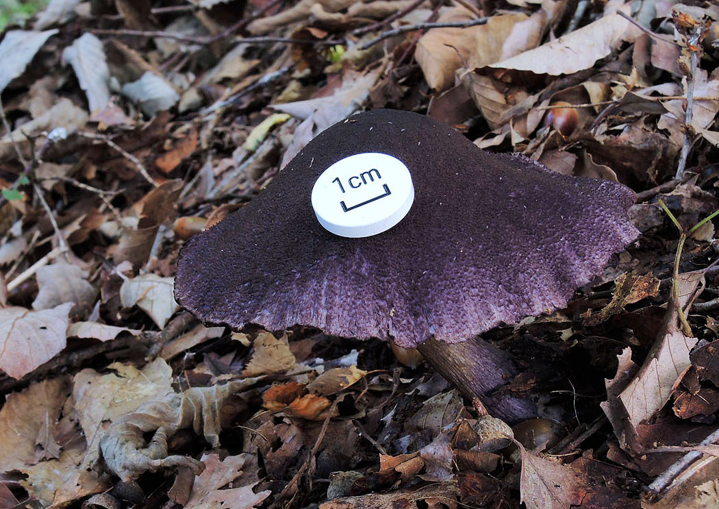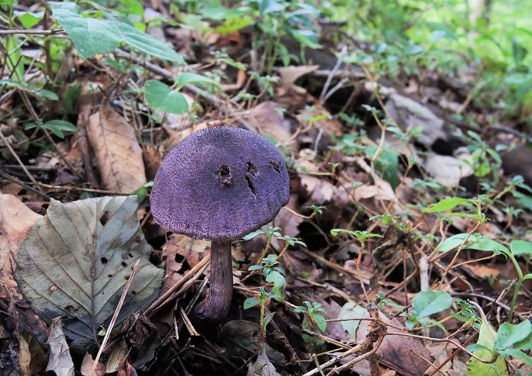 5.0-12.0cm 丸山形→まんじゅう形→中高の平ら 粘性無し 暗紫色 微毛密布→細かいささくれ鱗片生じる