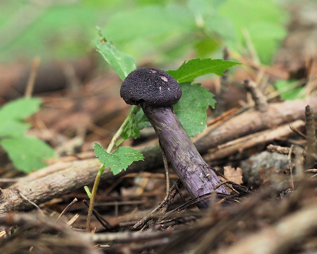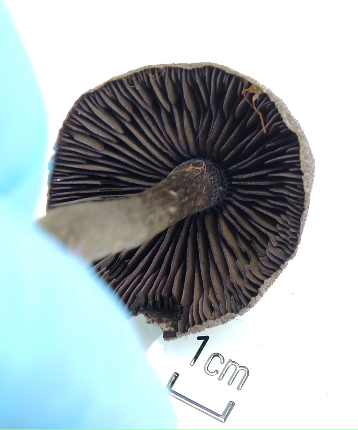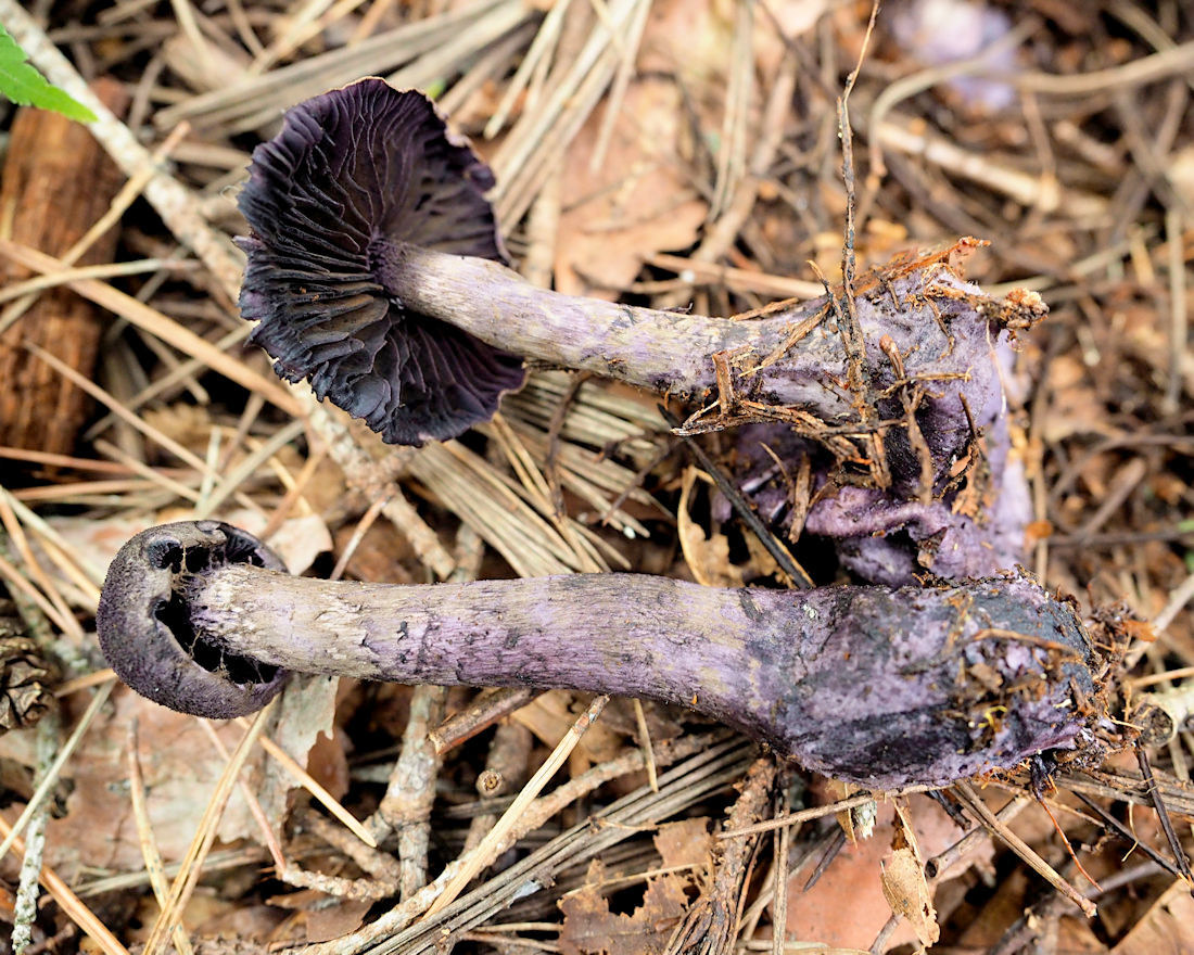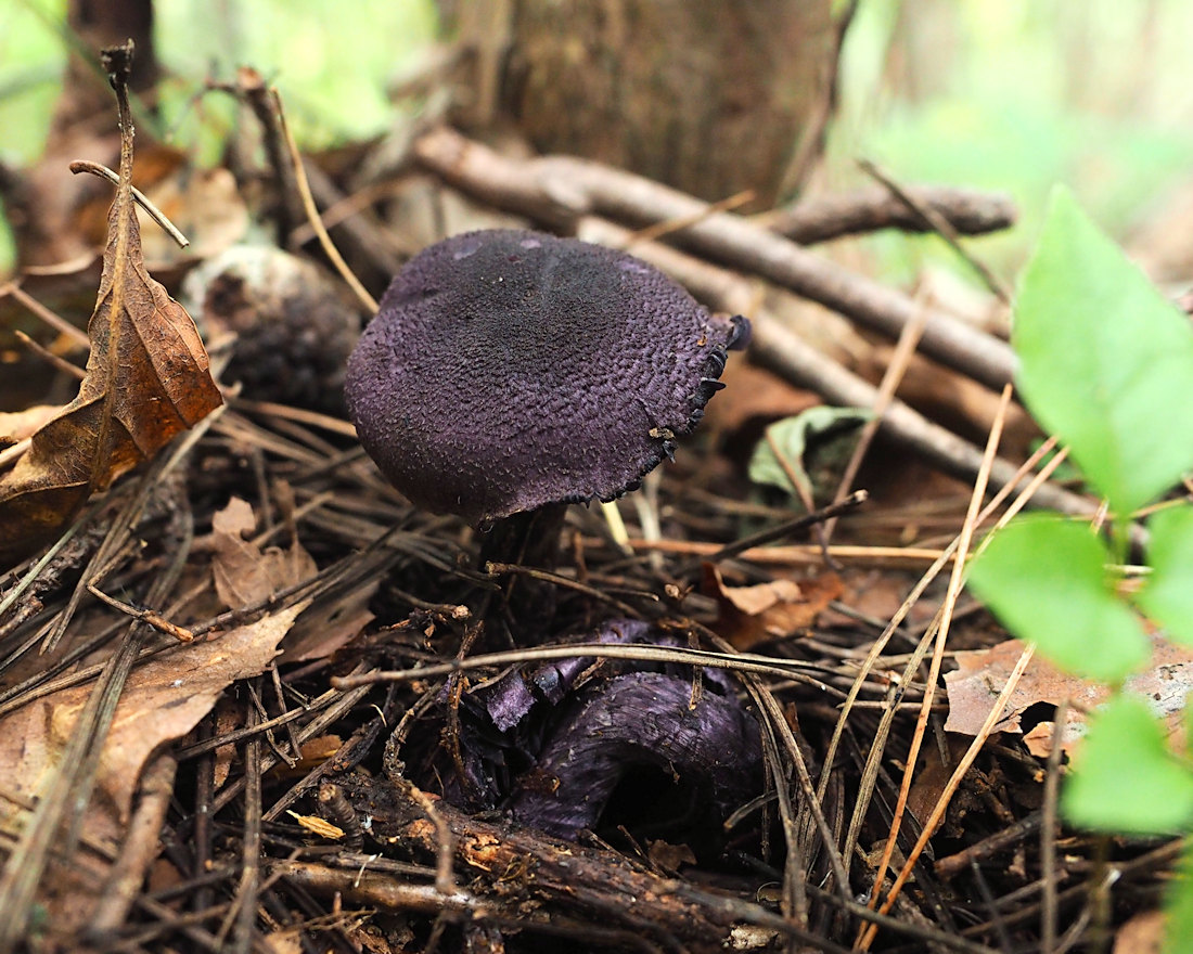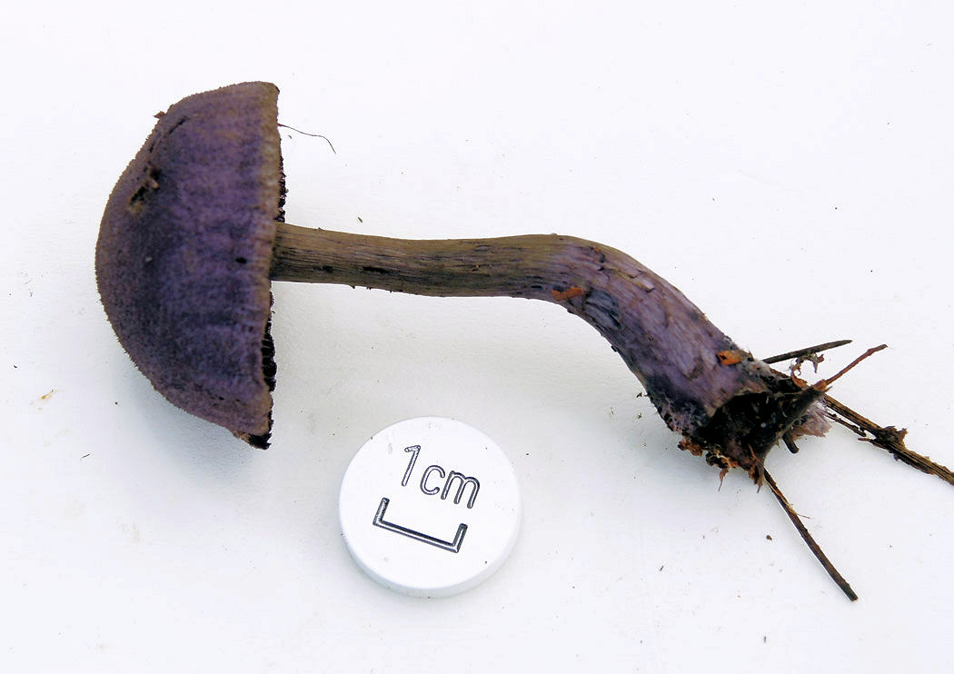 7.0-12.0p×10-25o 下方に向かいやや太まる 下部は膨らむ 暗紫色 ビロード状→繊維状−しばしば鱗片生じる つばはくもの巣膜状で青紫色→胞子落下付着しさび褐色