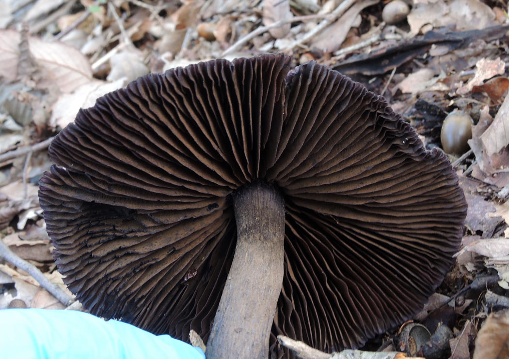 暗紫色→胞子のためさび褐色 直生−上生 幅広い10mm内外 疎