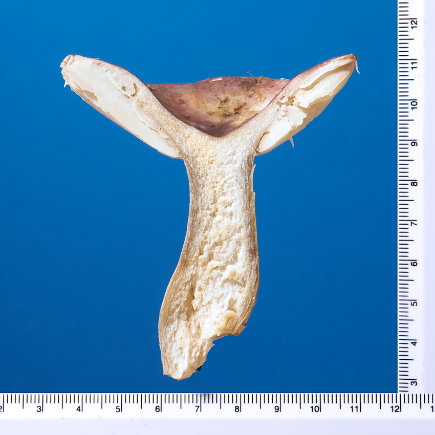 胞子紋は白色 胞子は卵状類球形 あらいとげとそれらを結ぶ微細な連絡糸があり、網目模様をつくる