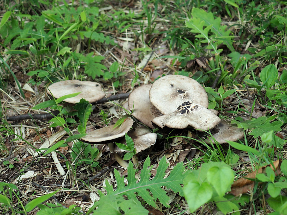 2013年07月20日撮影地 安達太良の画像は,ナカグロモリノカサに似ているが,傘表皮が褐色な点で異なる。ナガグロモリノカサの傘は帯褐灰色−ほとんど黒色の繊維状細鱗片覆う。