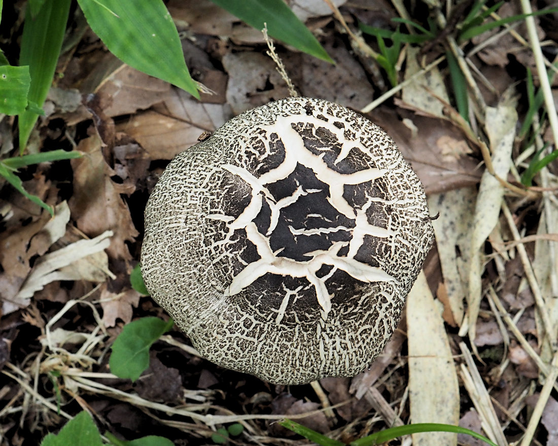 3.0-10.0p 半球形→饅頭形→平ら 地色は類白色で絹状 表面粘性無し 帯褐灰色−ほとんど黒色の繊維状細鱗片化する 中央部は鱗片化せず灰黒色 頂部平坦 ほとんど表皮残す