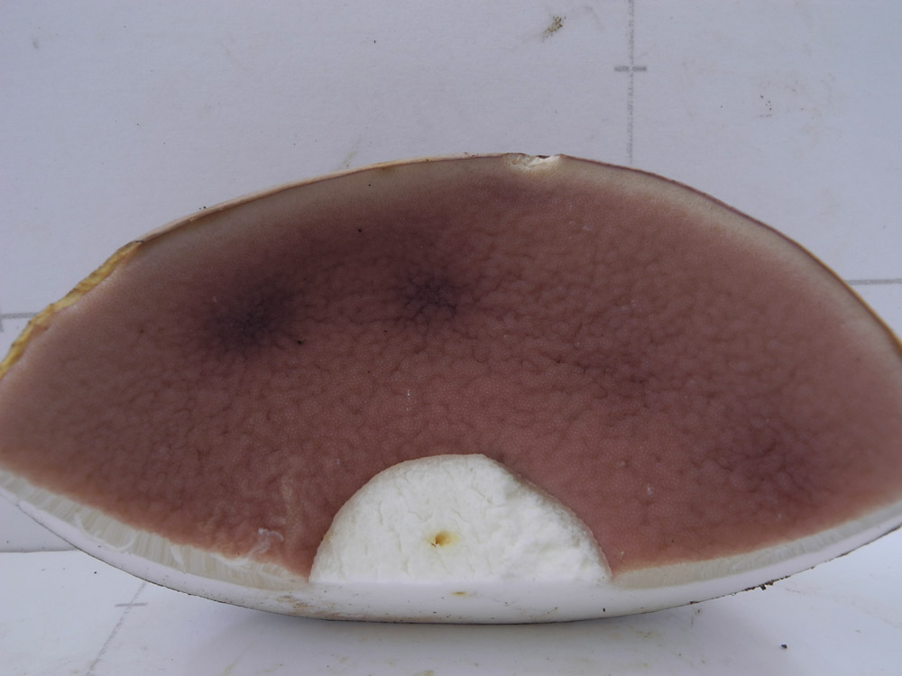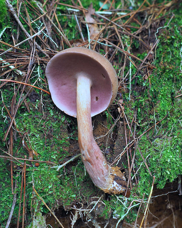 5.0-11.0cm饅頭形→ほぼ平 オリーブ褐色−淡紅褐色−帯紫褐色 ビロード状 粘性無し