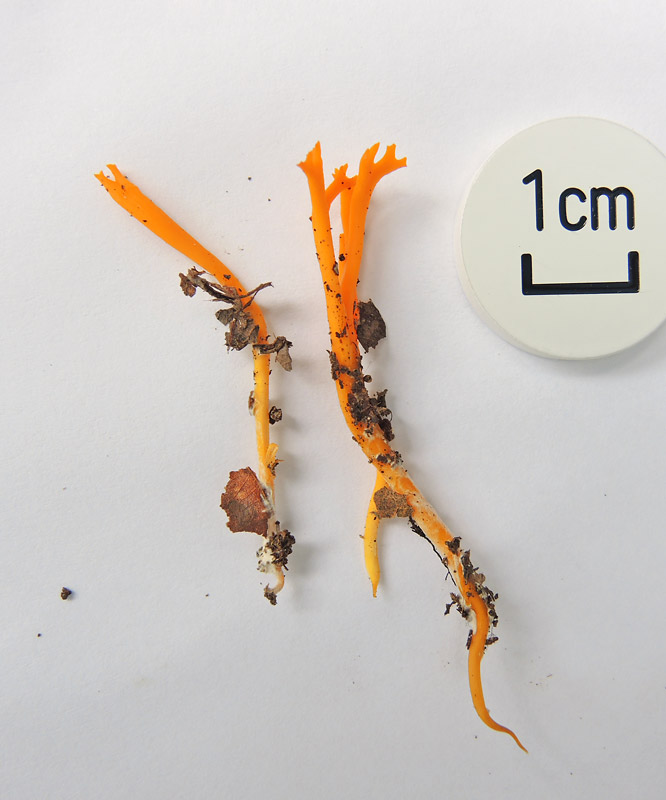 高さ2.5-5.0cm ホウキタケ形-珊瑚状 基部は円筒形−圧縮された円筒形 先端は小さい円錐形 先端に向かい 二叉分岐繰り返し先に向かい節間狭まる 弱粘性 鮮橙色−橙色−濃黄色 折れにくい