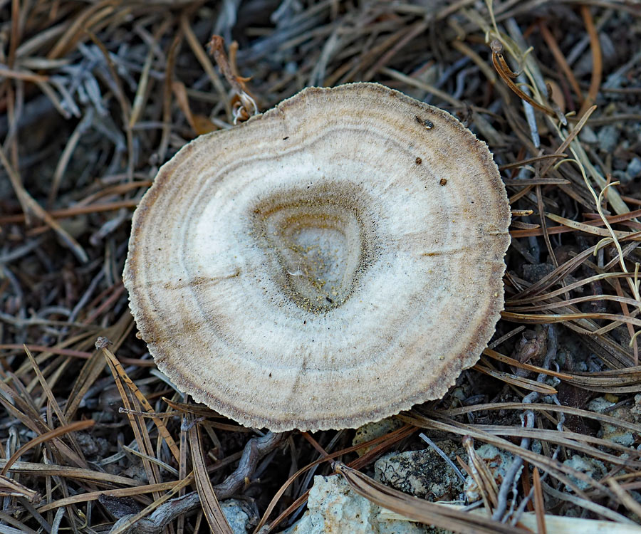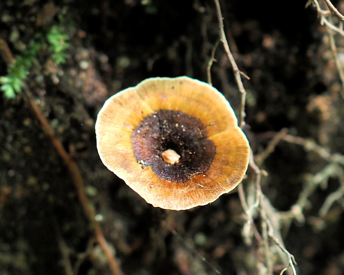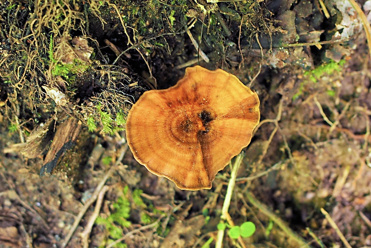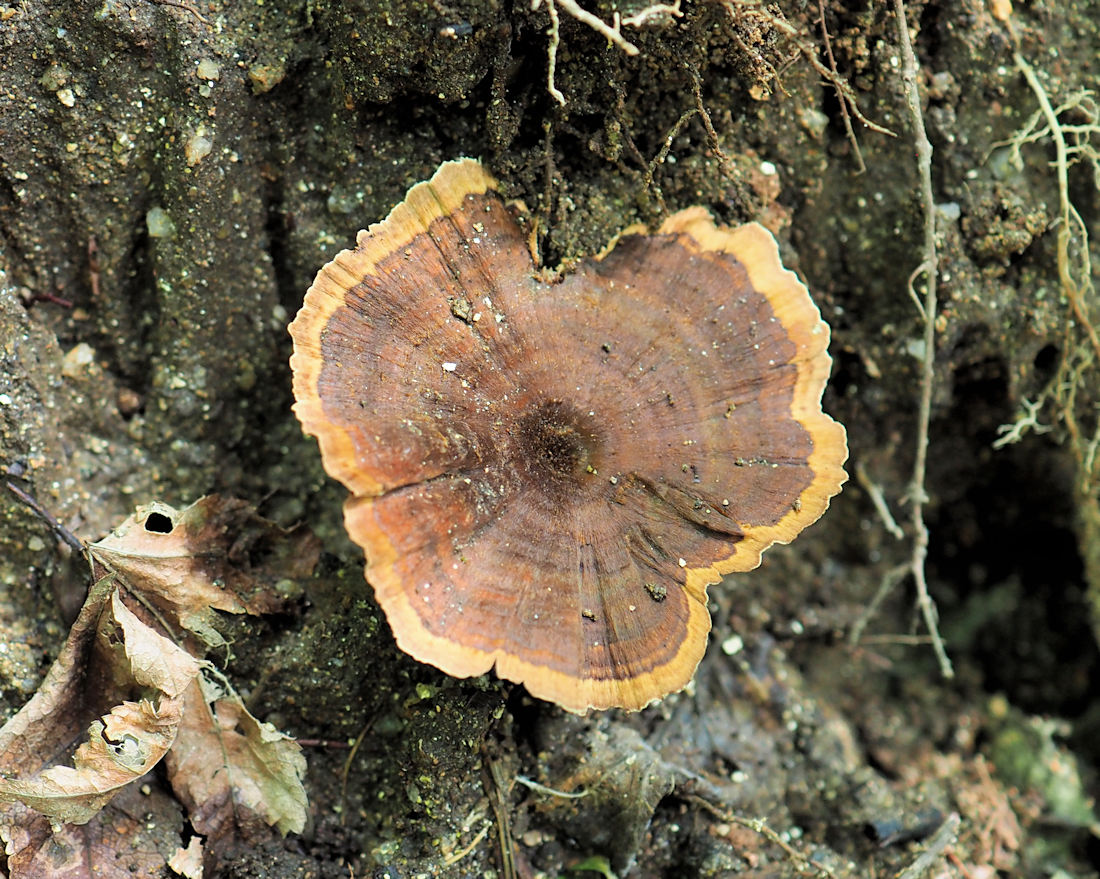 径1.0-4.0cm、厚さ1.5-3o 中心はへそ状にややくぼむ ややもろい革質 黄褐色−さび褐色 同心円環紋と放射状繊維紋表す 絹糸状の光沢あらわす 縁は歯牙状−全円