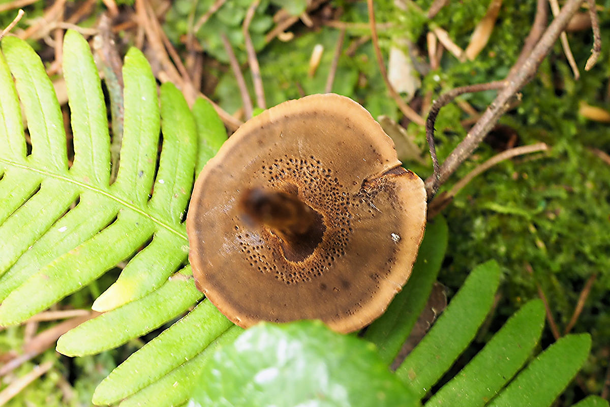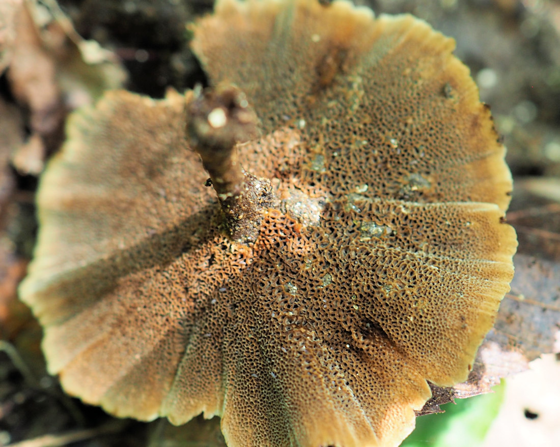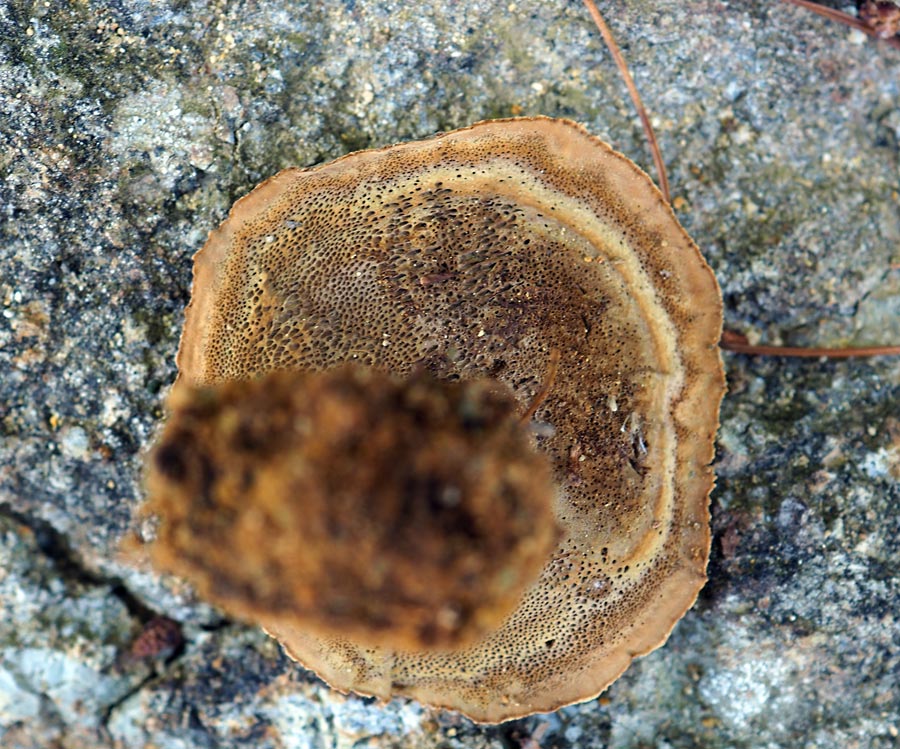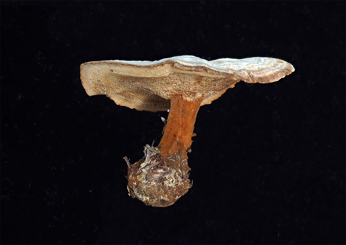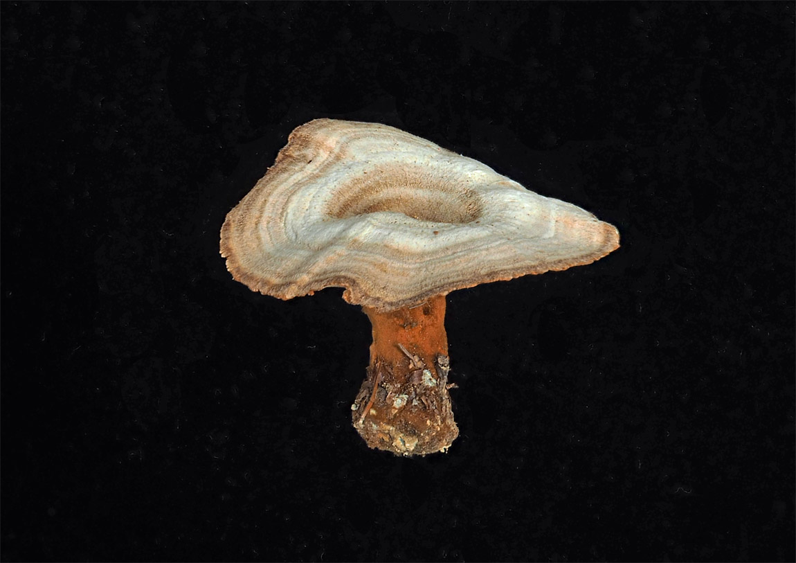 径1.0-4.0cm、厚さ1.5-3o 中心はへそ状にややくぼむ ややもろい革質 黄褐色−さび褐色 同心円環紋と放射状繊維紋表す 絹糸状の光沢あらわす 縁は歯牙状−全円