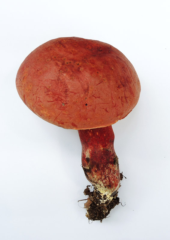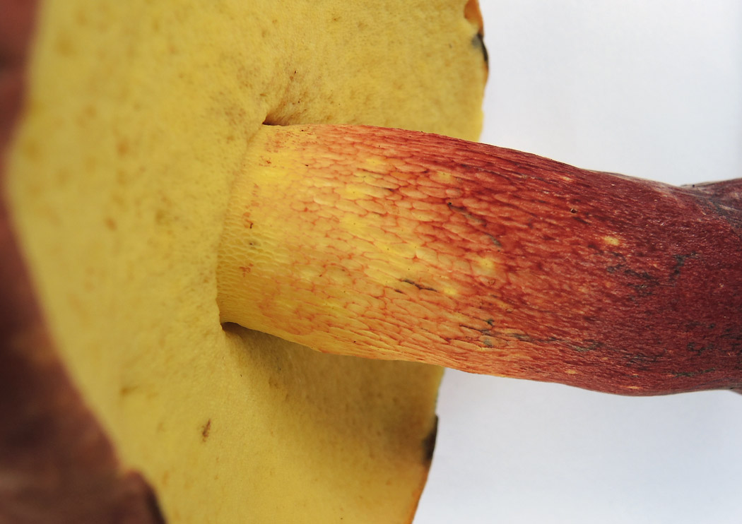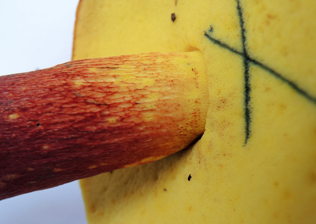 5.0-13.0p×19-45mm 上下同径で基部細まる−下方に向かって太まる 地色は黄色 柄の中ほどまで網目表す−全面に網目を表し下方へ向かって縦長不鮮明−ときに頂部のみもある 網目の色は頂部は黄色で下方は赤色 下部は帯赤褐色細粒点に覆われる 擦ると青変する 基部は黄白色の菌糸体に覆われる 中実