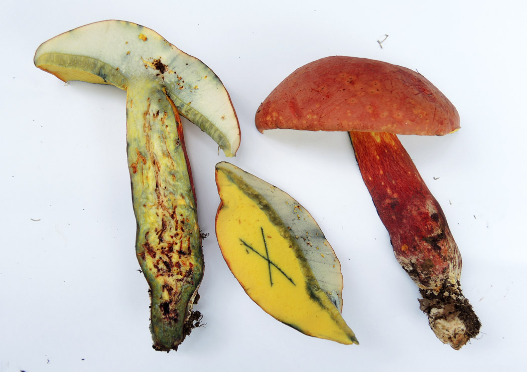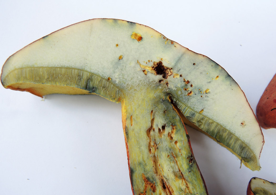 長さ2-11o 黄色→帯緑黄色 陥入−上生 傷つくと速やかに青変する 孔口は1-3個/o 類円形→類多角形 傷つくと速やかに青変する