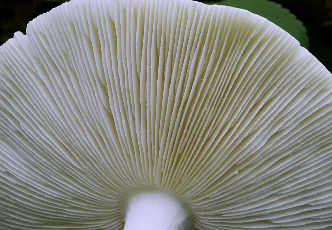 帯淡黄白色−帯黄白色−類白色 上生−ほとんど離生 密 縁は細かなフリル状−極小鋸歯状 幅3-9o 小ひだは斜めに裁断状