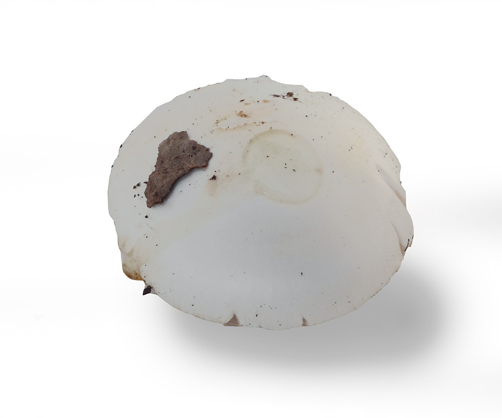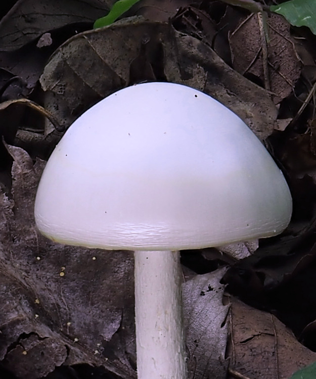 4.0-11.0p 丸山形−鈍円錘状卵形−類円錘状山形→平ら 湿時弱粘性 無毛平滑 白色−ときに中央部帯淡黄白色 周囲に条線・条溝なし 幼時ときに成菌でも傘の頂部―側部にしばしばつぼの破片付着する
