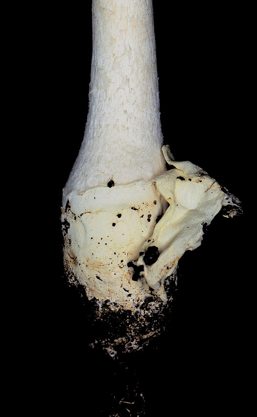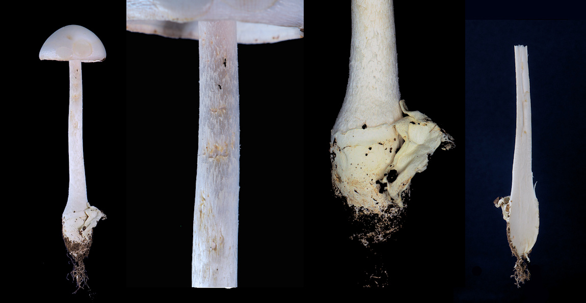 長さ6.0-17.0p×.4-15mm 基部はこん棒状−紡錘状−球根状に太まる 基部径は1-4p 白色でいちじるしいささくれた綿条繊維 乾燥するとうろこ状となることある 成菌ではときに風化してやや不明瞭−ほとんど平滑になる 中実→やや中空−中空 柄の上部に膜質の薄いつばあり つばは極淡黄白色−黄白色−淡黄土色 つばはマント状に垂下 上面に細い条線あり 周辺部に小綿状物つける つぼはやや薄い膜質 白色−帯黄白色 袋状 ぼの下部は肉部と接続しその区分は不明瞭