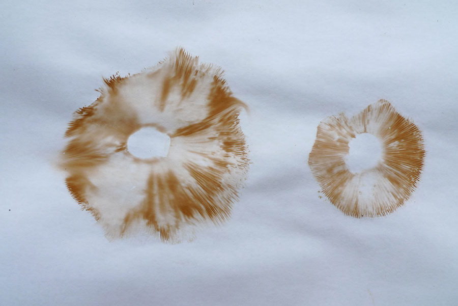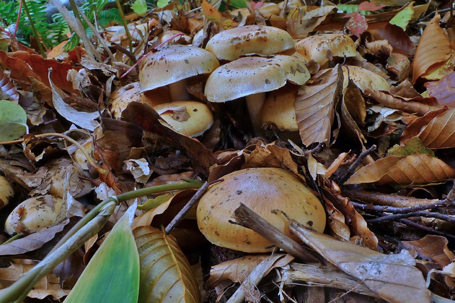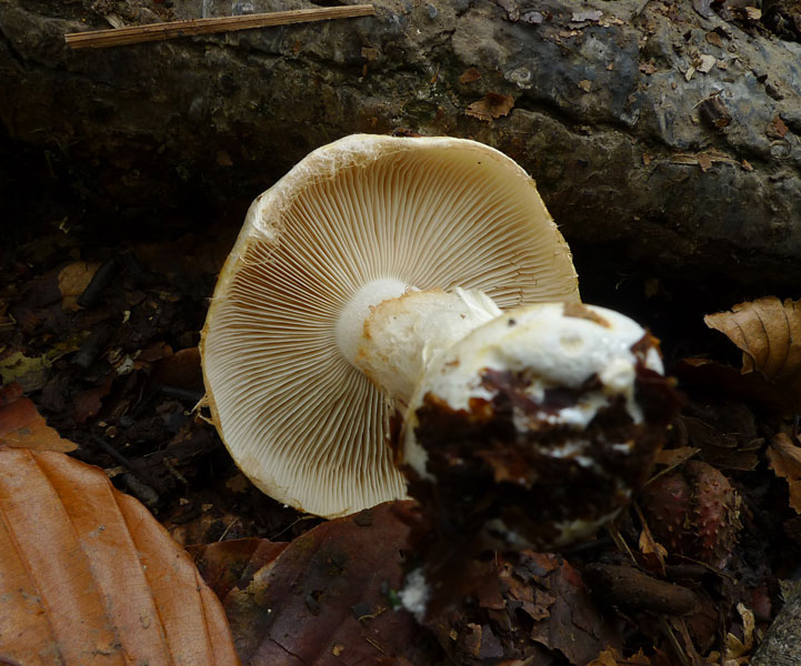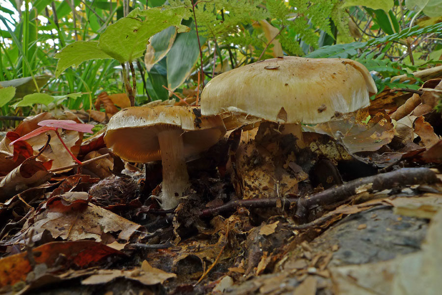 4.0-10.0cm 饅頭形→中丘の平−ほとんど平 淡黄土色−帯褐橙黄色−黄土褐色 湿時強粘性あり 白色絹状光沢のある繊維状皮膜におおわれる→消失する 乾燥時光沢あり