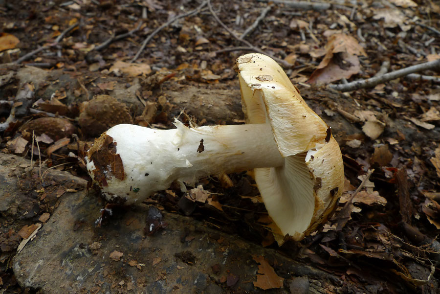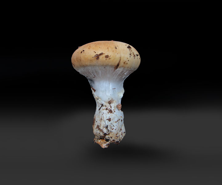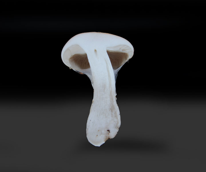 5.0-10.0cm×7-18mm 逆こん棒形 基部膨大し塊茎状−塊茎部の無いこともある 白色→黄土色−黄土褐色 頂部わずかに帯青み 表面繊維状−帯黄土色繊毛密着 上位にクモの巣状つばあり 中実