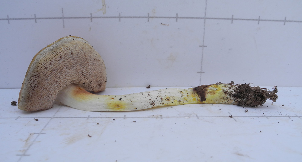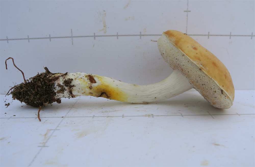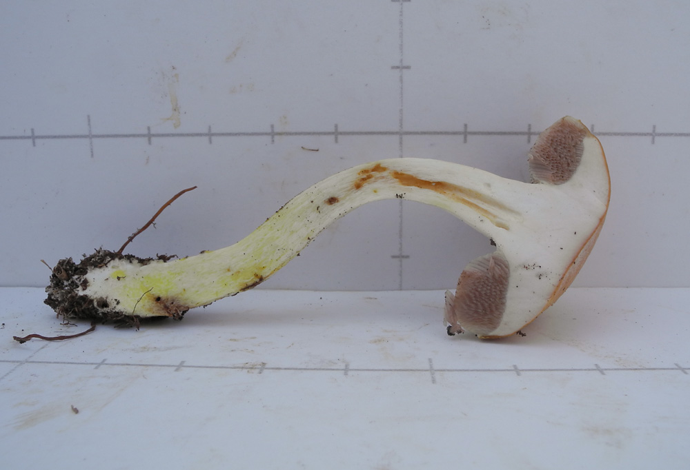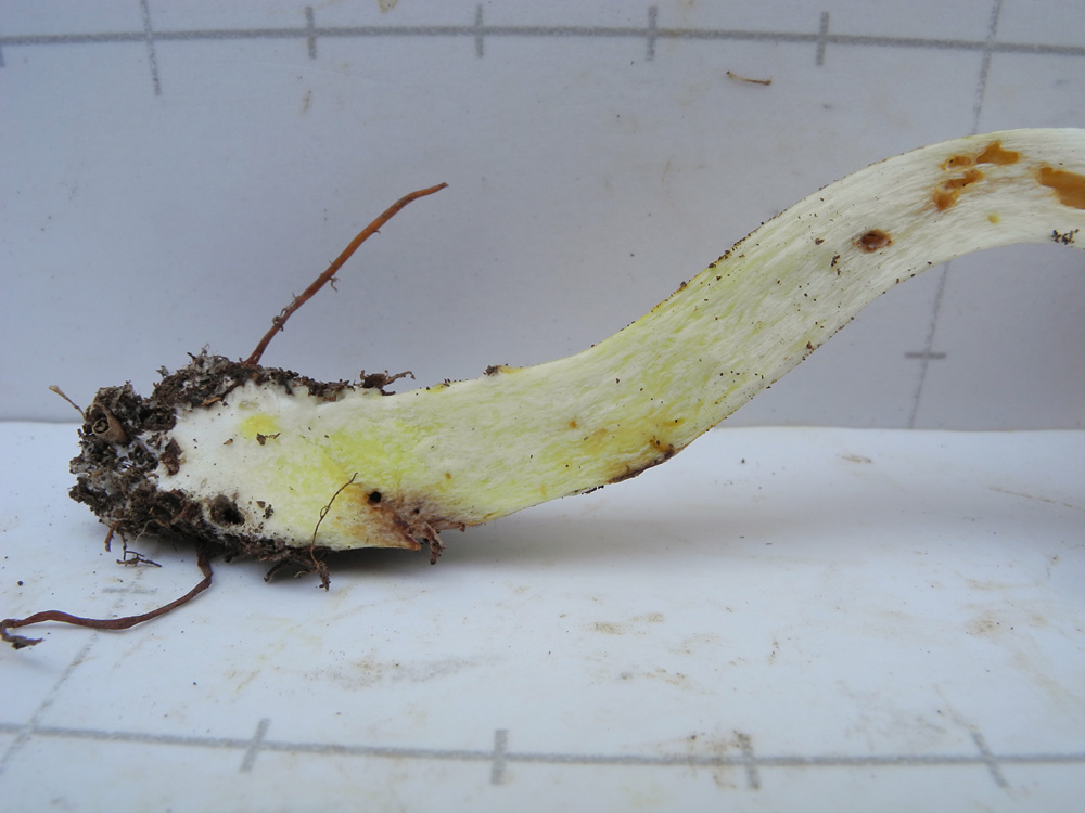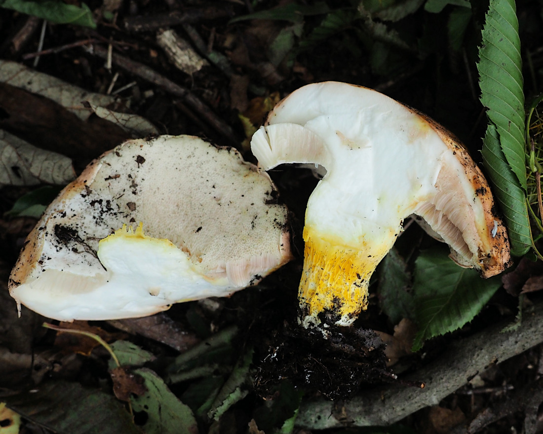 白色 傘部表皮下は表面色 柄の下方は鮮黄色 軟質で粘りあり 苦い
