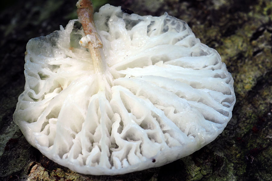 ほとんど白色 湾生−直生 疎 長く脈状となって柄の上部に続く 厚く幅広い しわ状に縮れる 互いに脈状につながる