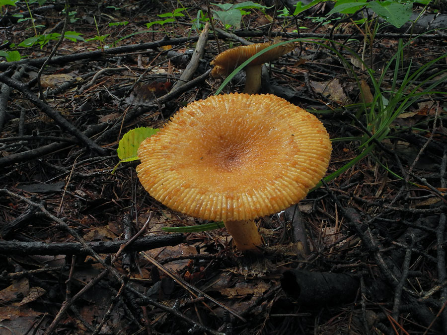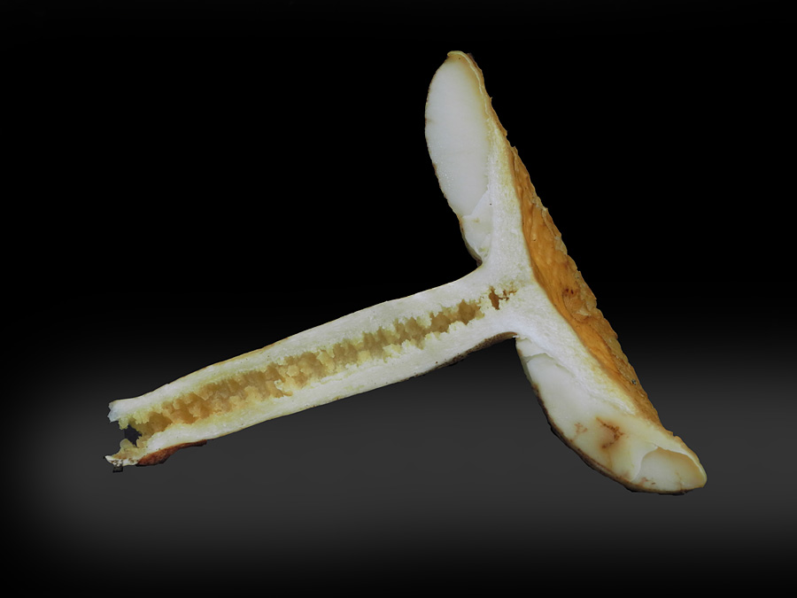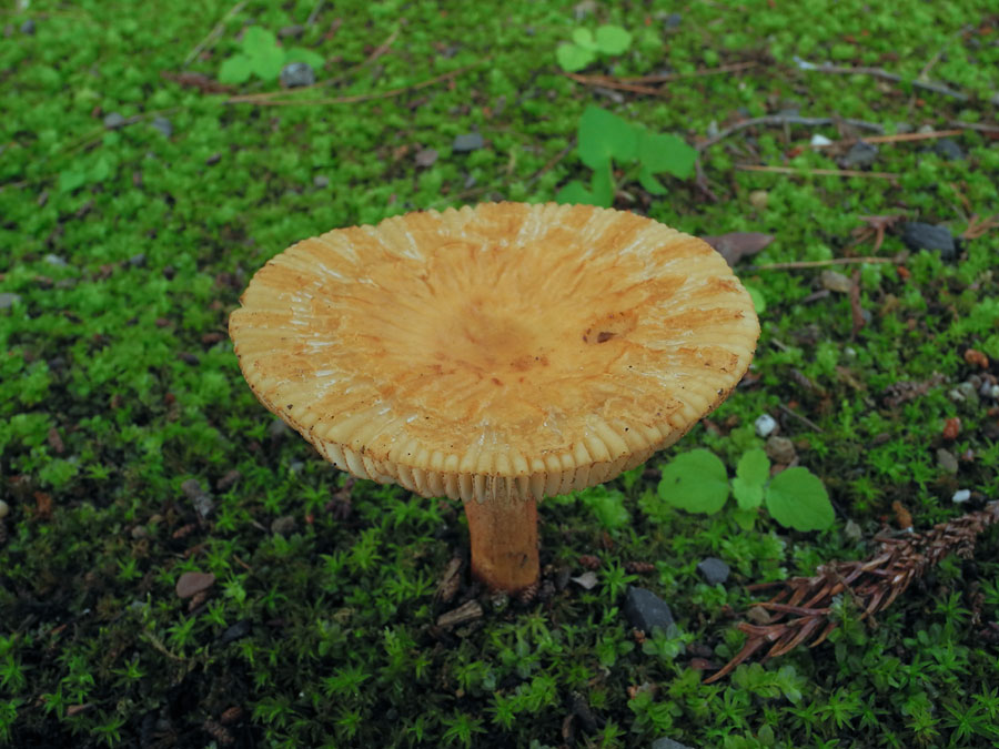 5.0-13.0cm 饅頭形→中央やや窪む平 黄土褐色−汚黄土色 粘性無し 顕著なしわあり 成熟で放射状に表皮裂開し黄土白色の地表す 周辺に明瞭な粒状線あり