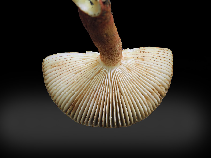 黄白色−汚白色 縁部褐色−黒褐色に縁取られる やや密 ほとんど離生 幅8mm内外