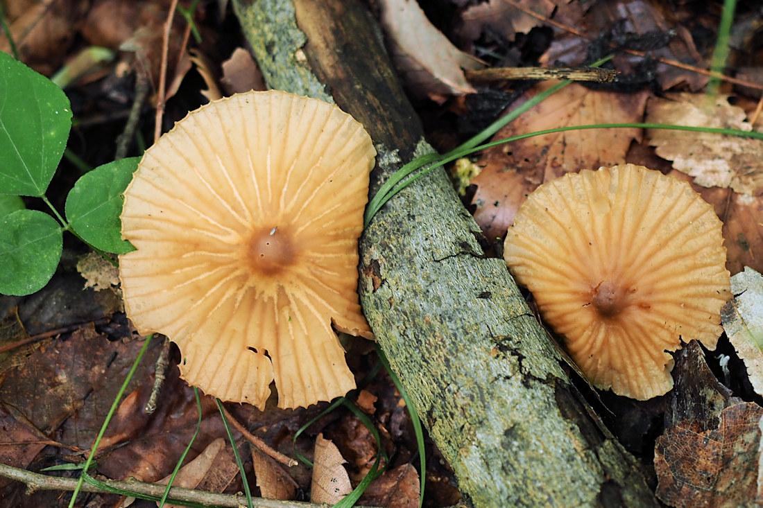 3.5-11.0cm 鐘形→饅頭形→やや中高の平ら 表面は放射状のひだ状の溝をなす 中央に多少しわみられる うすなめし皮色(明るいベージュ【薄茶色−淡黄色−白茶色−明灰赤を帯びた黄色】) 中央部は帯褐色 乾けば帯白色