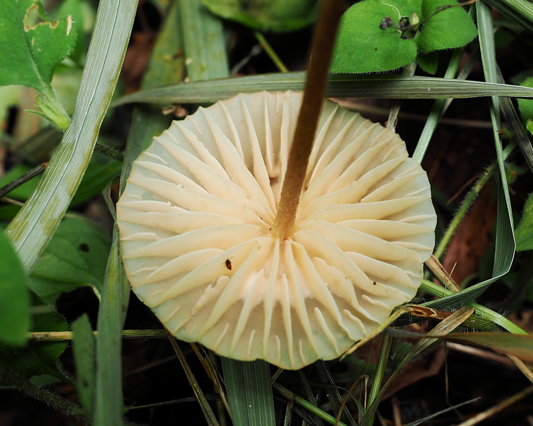 白色−傘より淡色→帯褐白色 上生−離生 疎(長ひだの数は17-19枚)