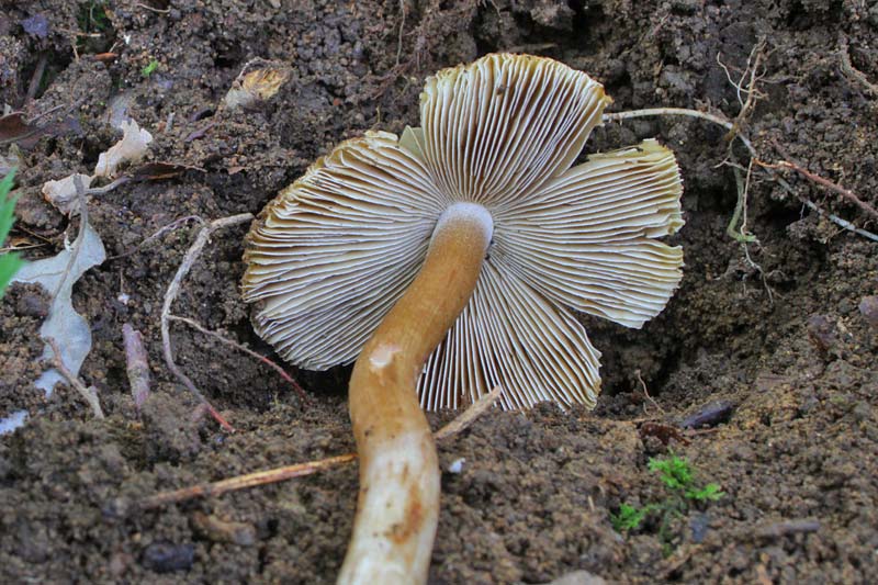 灰褐色−黄土色→オリーブ褐色 縁部粉状(傘裏を見ると白っぽくみえる) 上生−ほとんど離生 やや密 幅は1.5-5mm