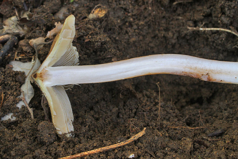 2.0-6.0cm×2-5mm 上下同径−下方に太まる 基部やや球根状に膨らむ 淡黄土色 ほぼ白色 繊維状 中実
