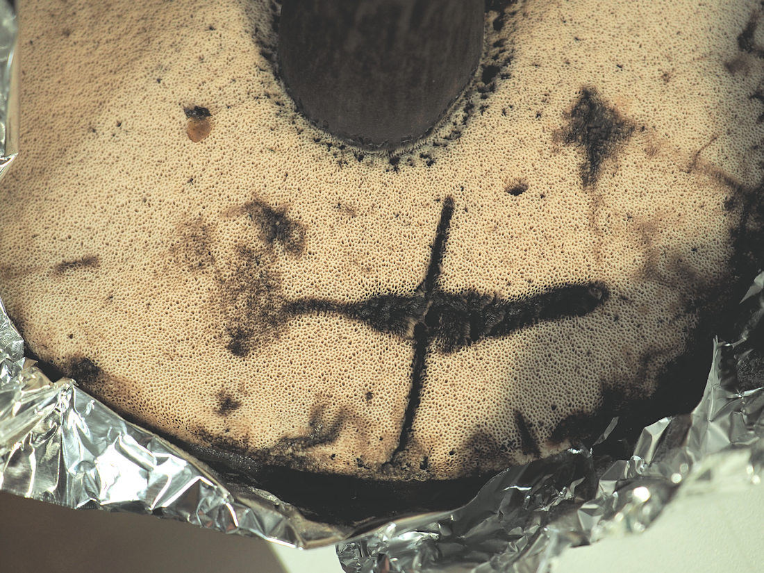 7.0-12.0cm まんじゅう形→平ら−中央ややくぼむ平ら 淡灰紅色−暗灰紅色 傷つくと黒色となる→全体黒褐色 表面粘性無し ビロード状