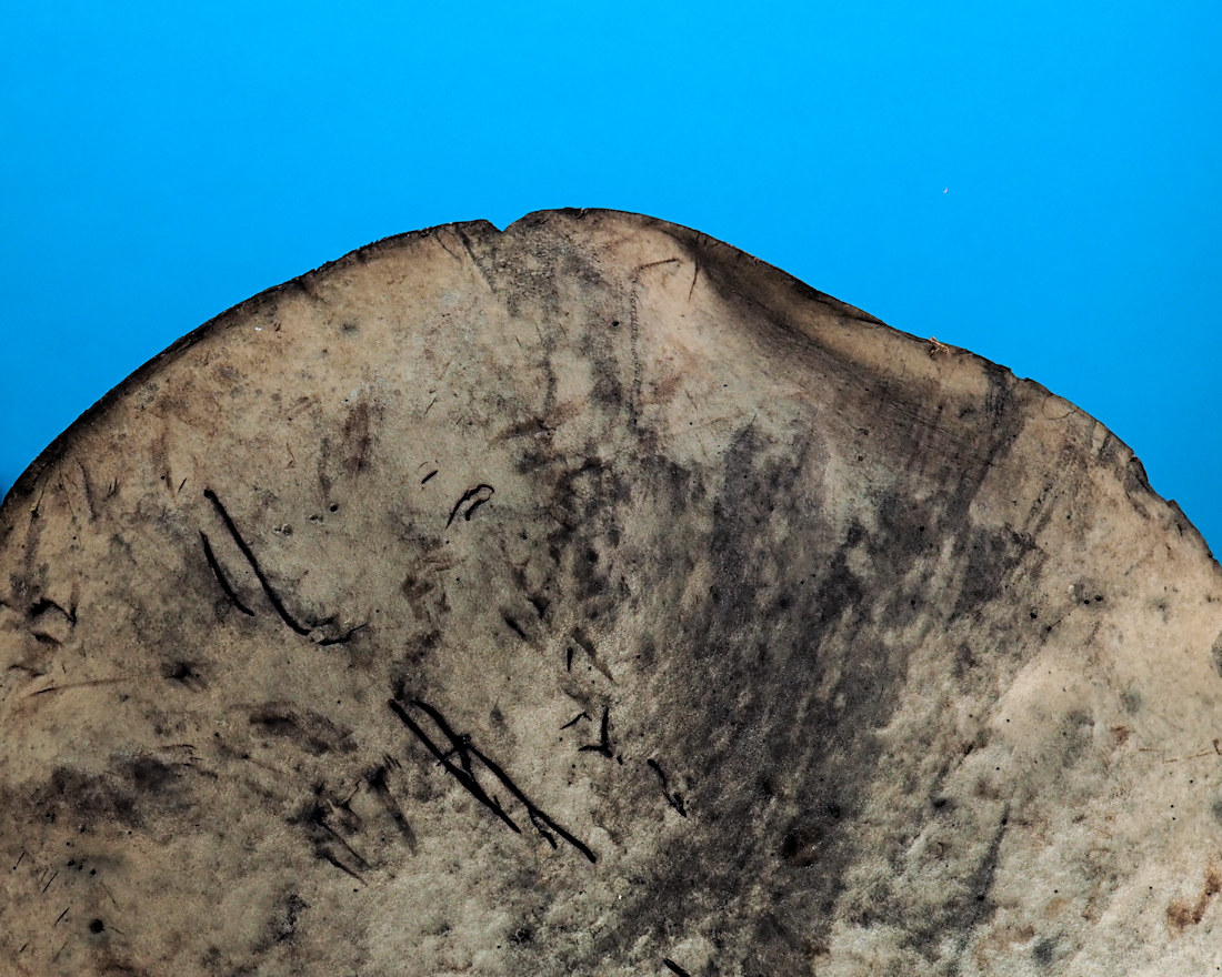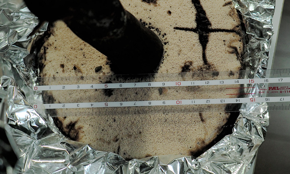 灰白色→淡紅色−暗褐色 傷つと紅変→黒変 直生→上生 孔長10mm内外 孔口も管孔と同色 多角形で小形 傷つくと黒変する