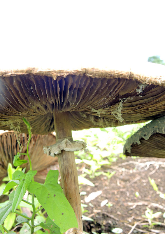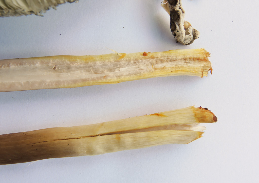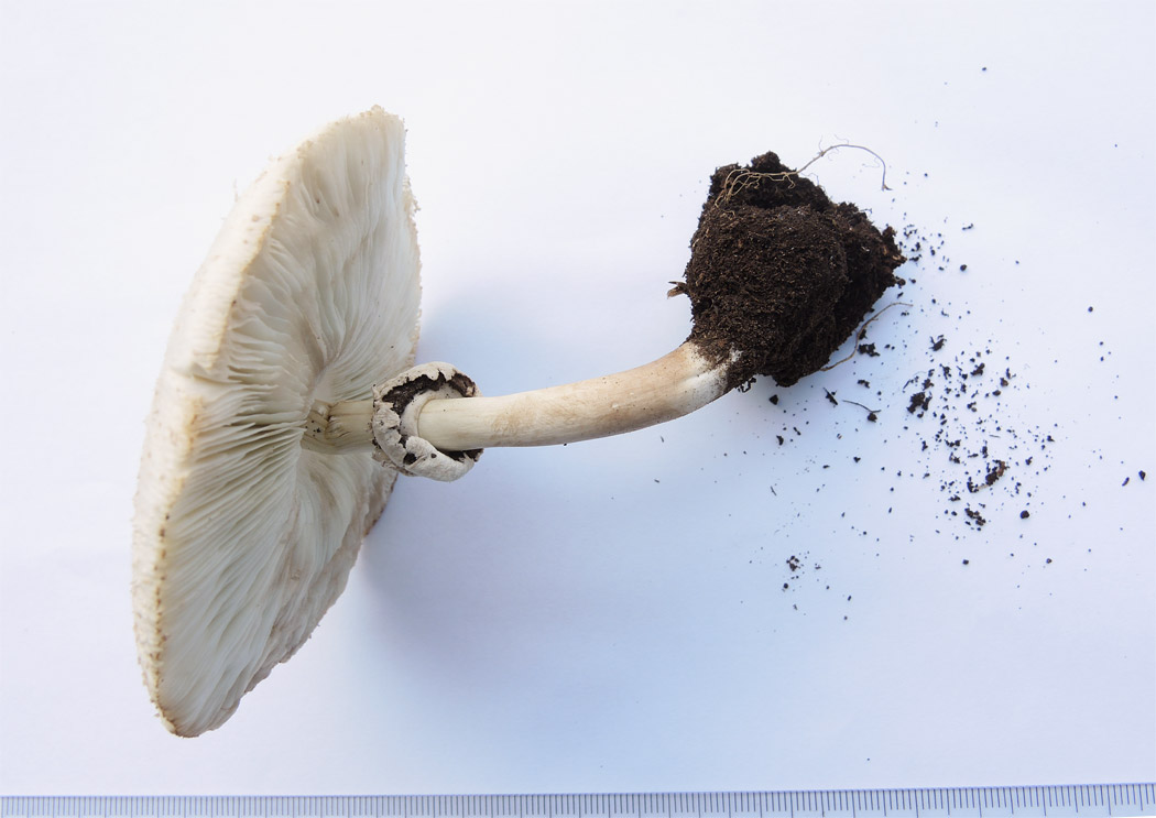 10.0-25.0p×10‐25mm 根もとに向かって膨らむ 基部膨らむ 表面繊維状 白色→灰褐色 上部に厚い可動性つばあり 中空
