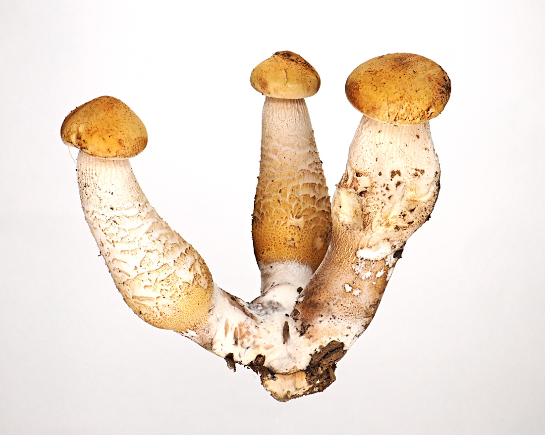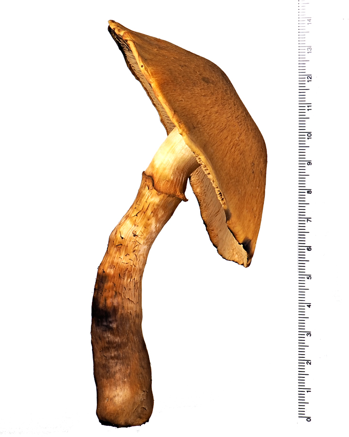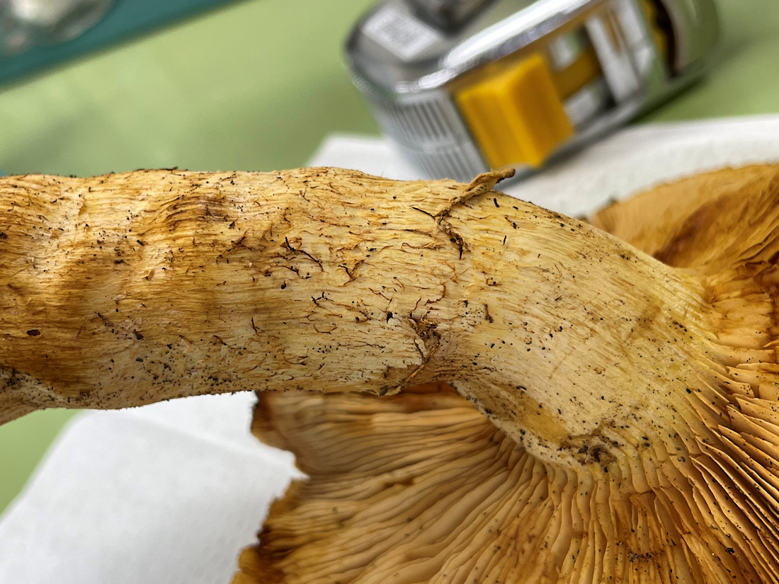 5.0-15.0cm×6-30mm 基部はやや紡錘形 傘より淡色 繊維状 上部に淡黄色膜質のつばあり 中実