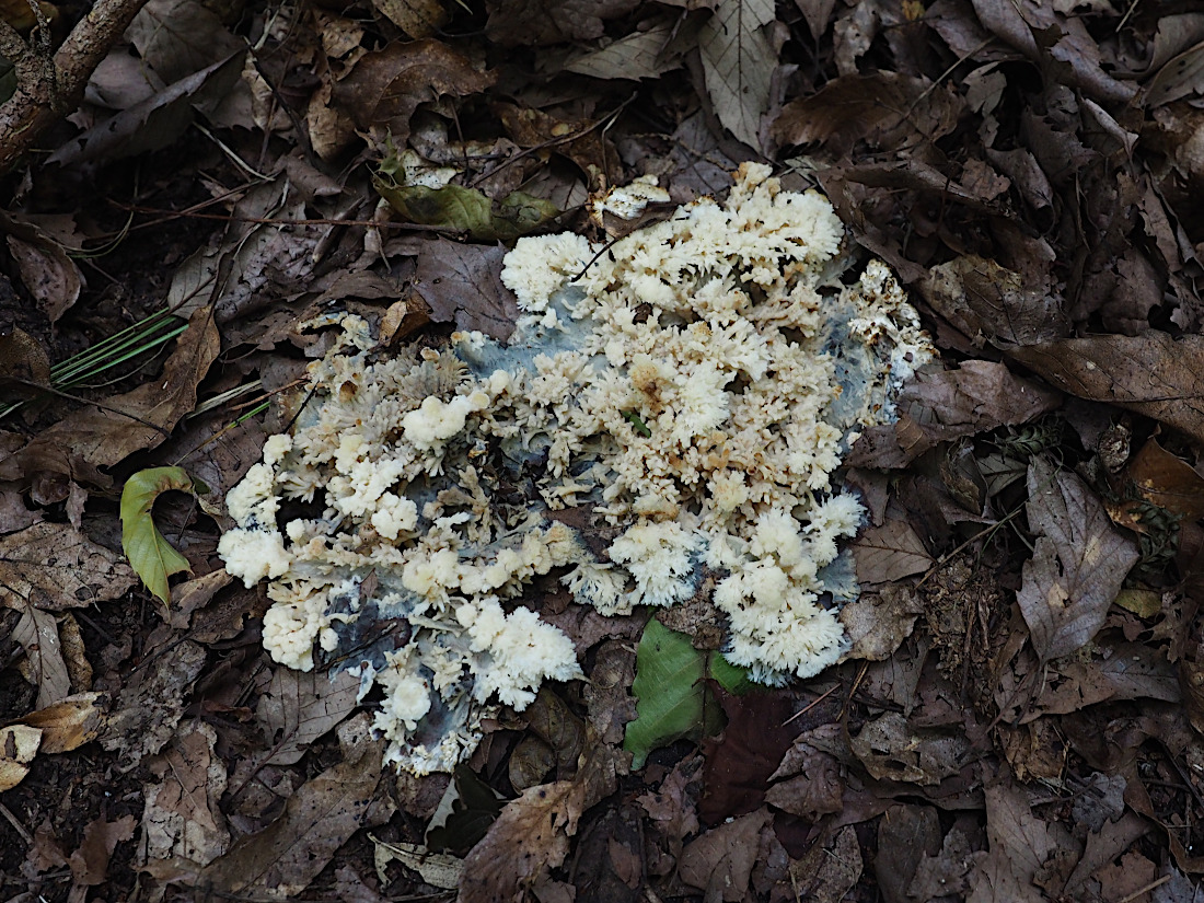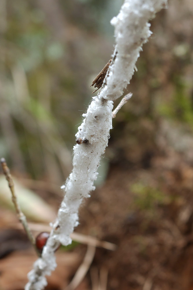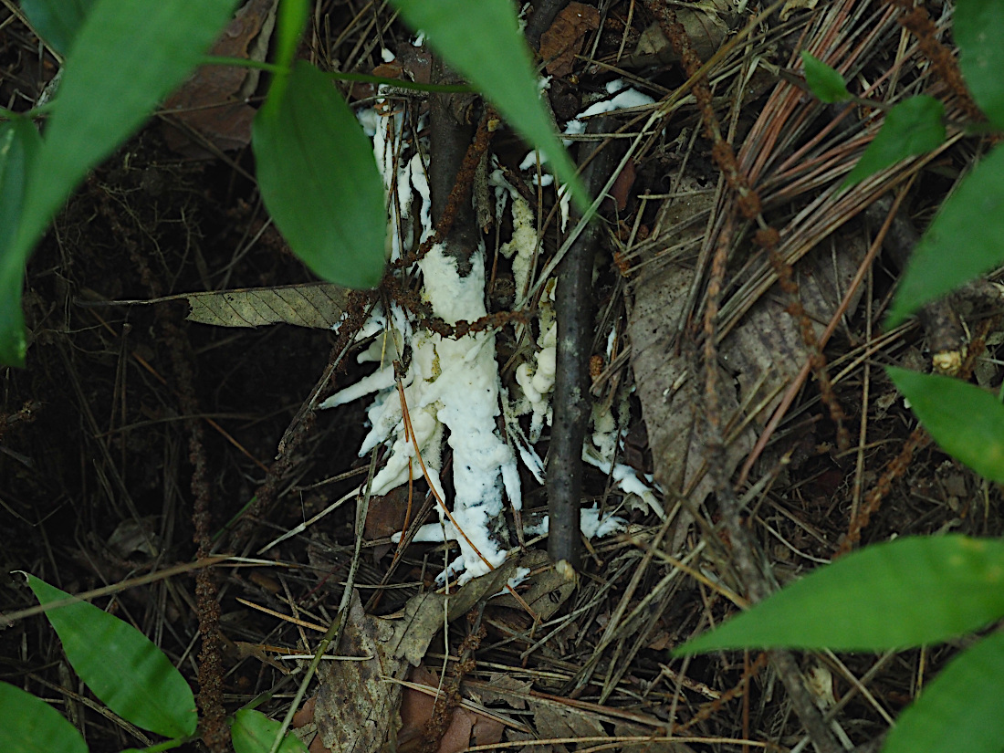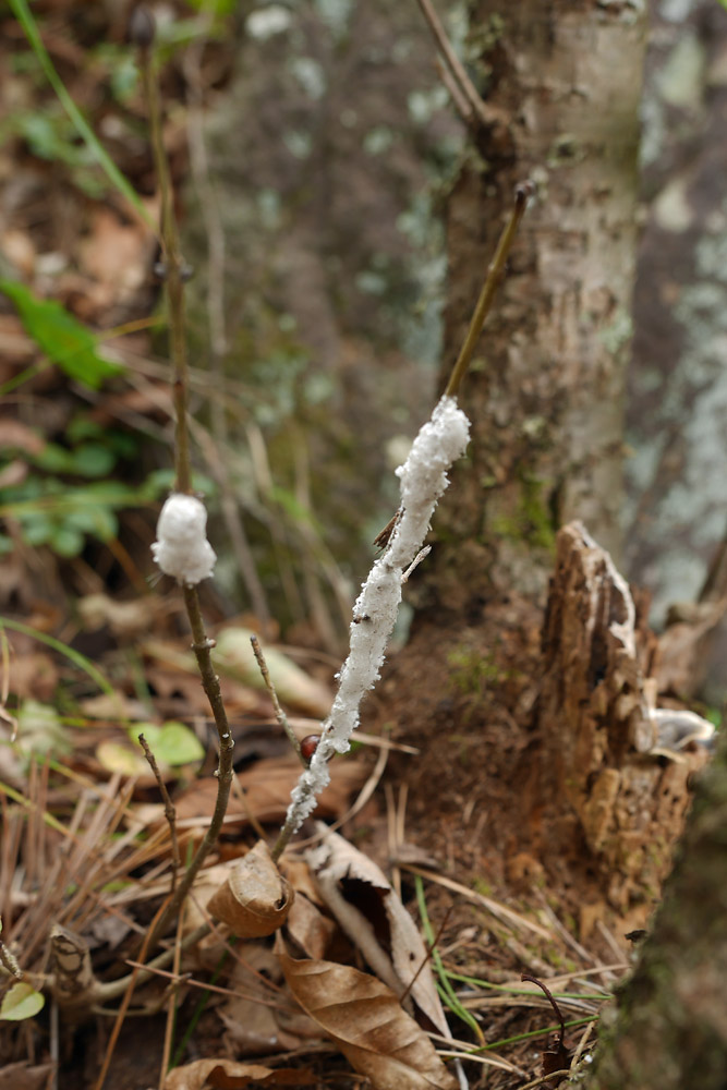夏〜秋に草地などの落ち葉、コケ類、落枝などに扁平に広がり発生する