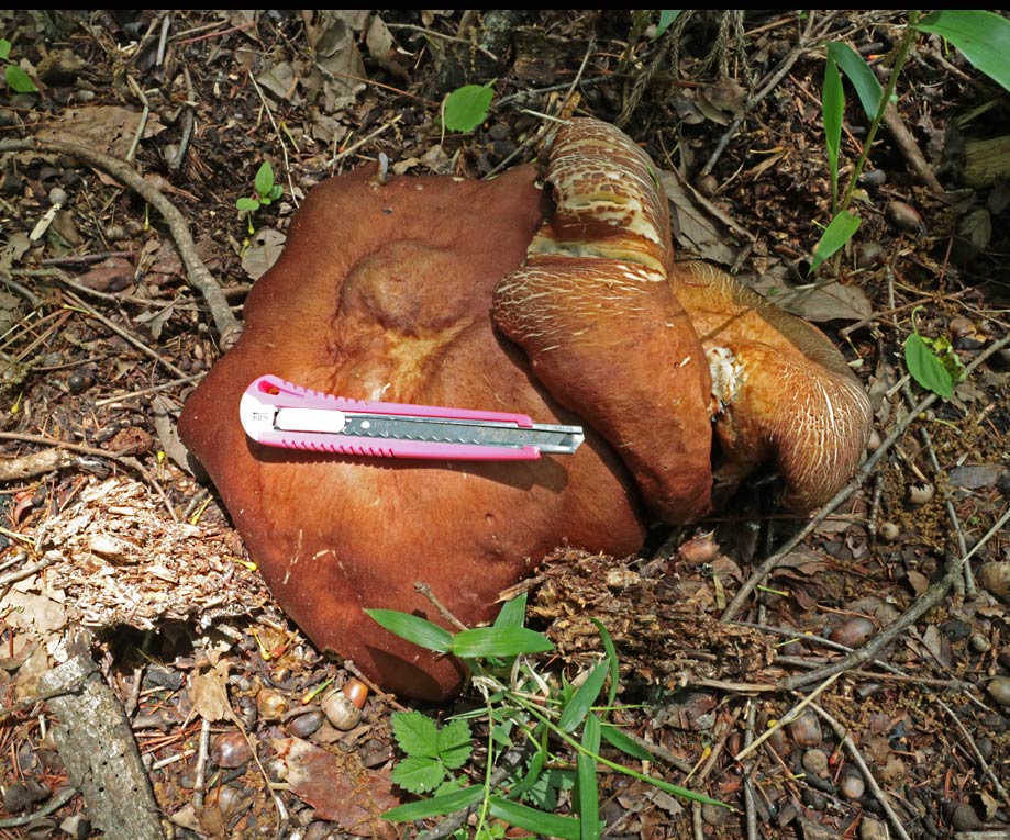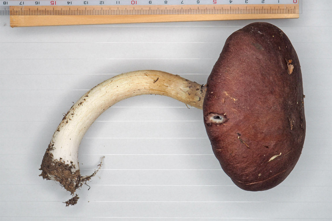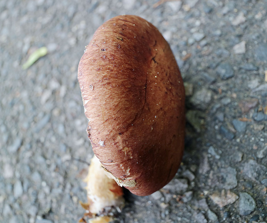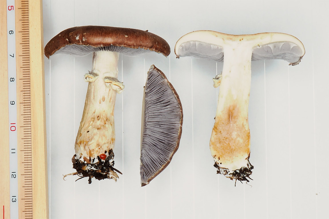 7.0-15.0p まんじゅう形→平ら 赤褐色−ぶどう酒褐色−暗褐色→褐色−灰褐色 平滑(内生繊維状−繊維状鱗被でおおわれる) 湿時粘性あり