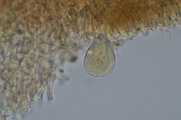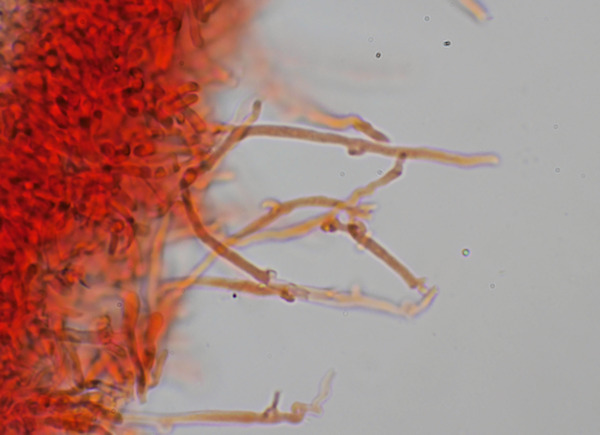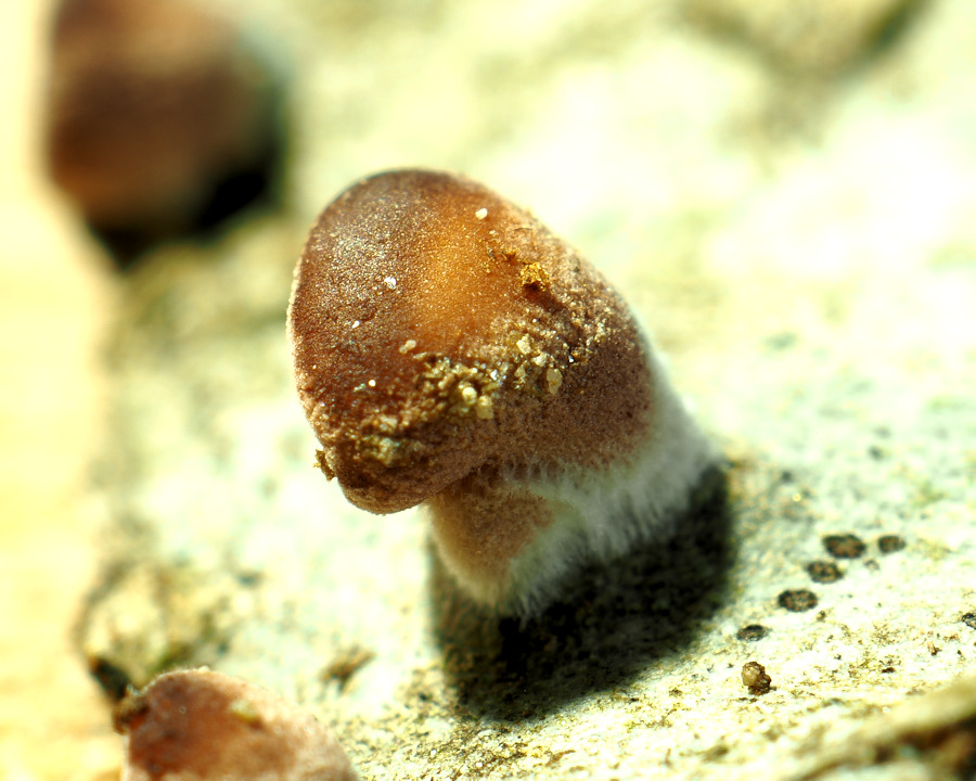柄は無く傘の一部で基物に着生