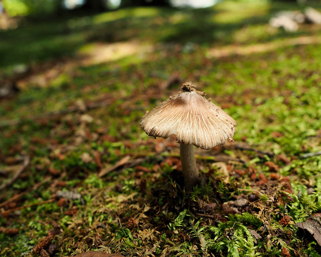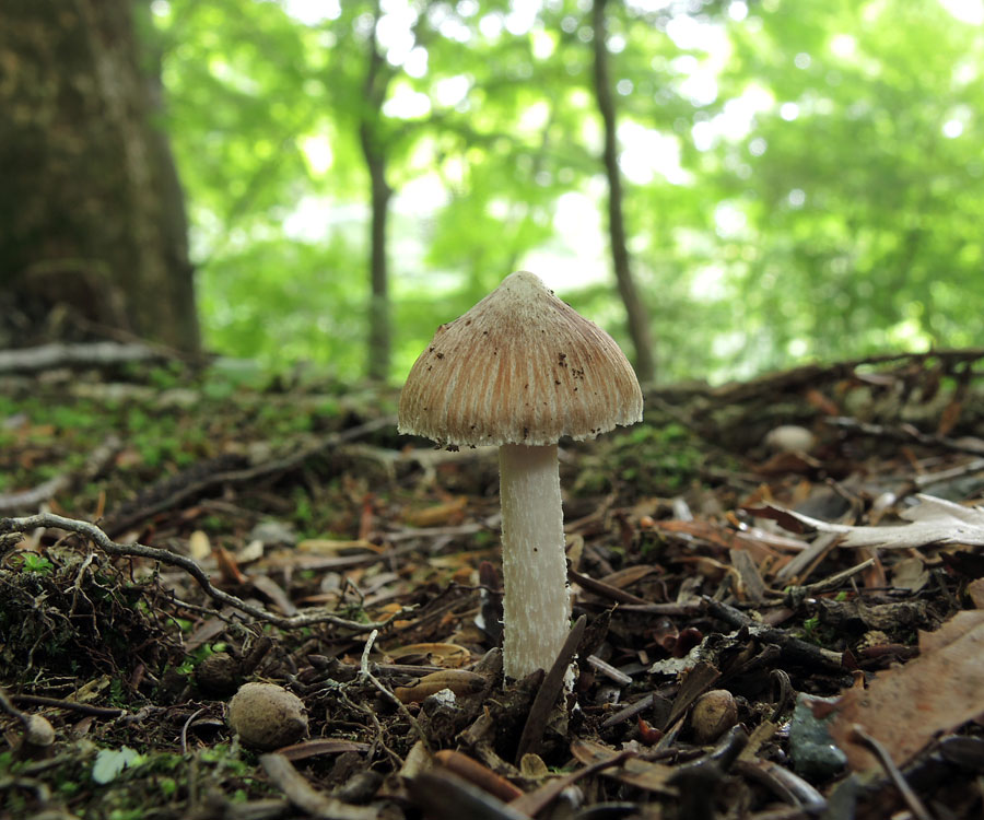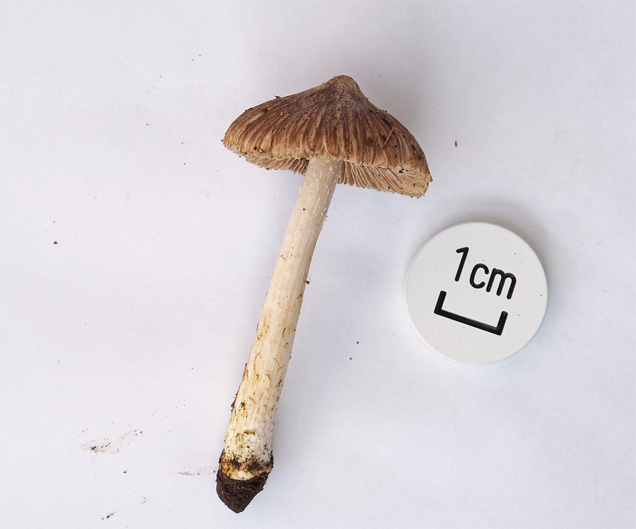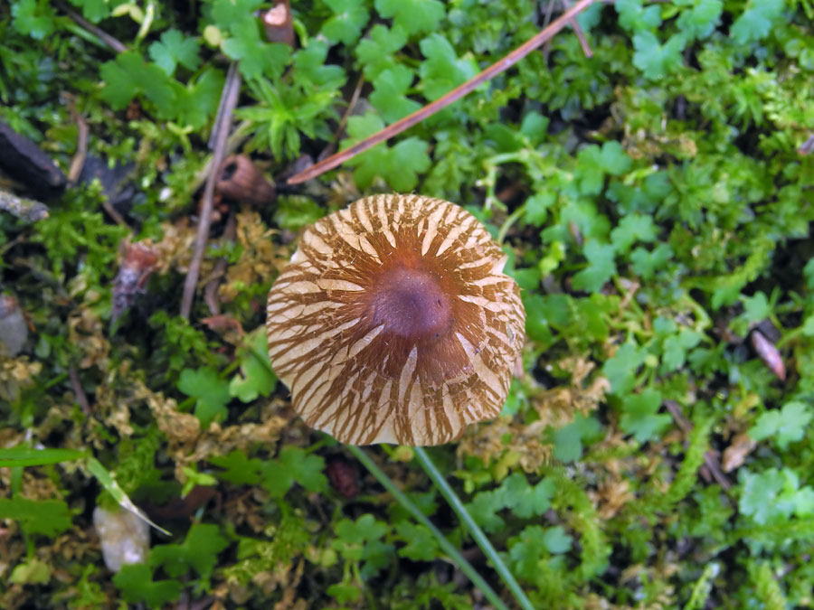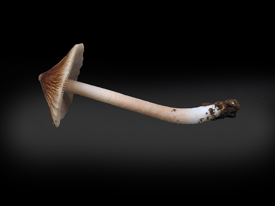 2.0-6.0cm 円錐形→中高のまんじゅう形→中高の平 赤褐色−暗褐色繊維状 白色外被膜を斑点状に付着→表皮は放射状に裂ける