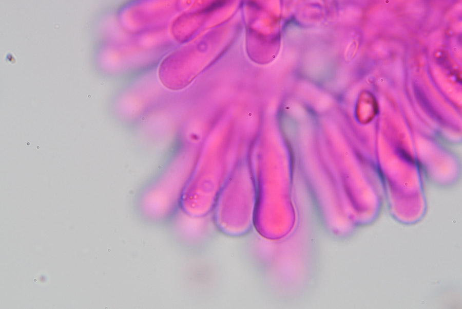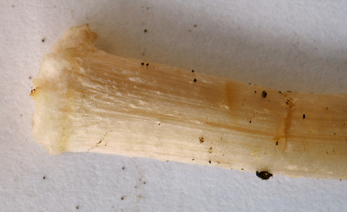3.0-11.0cm×3-8mm 上下同径−ときに多少ねじれる 類白色→下方から帯褐色 触れた部分は淡赤色に変色 表面は繊維状 中実−中空