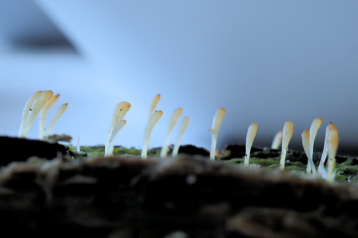 高さ1.0-2.0p 径1mm位 円筒形−平たいこん棒状−紡錘状 先端は細まる 殆ど分岐しない−ときに二又に分岐 白色−淡黄白色?で先端しばしば淡褐色おびる 柄は不明瞭だが透明感のあるやや淡褐色をおびた基部を持つ