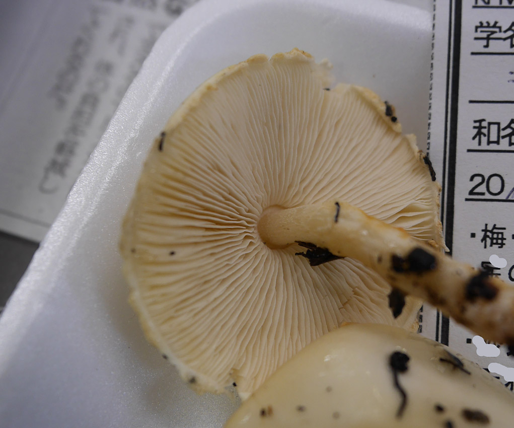 図鑑には記述が無い。←「青森県産のきのこ」工藤伸一著によると、柄に赤褐色のシミを生じるタイプあり、本種と同一種か要検討と記述ある