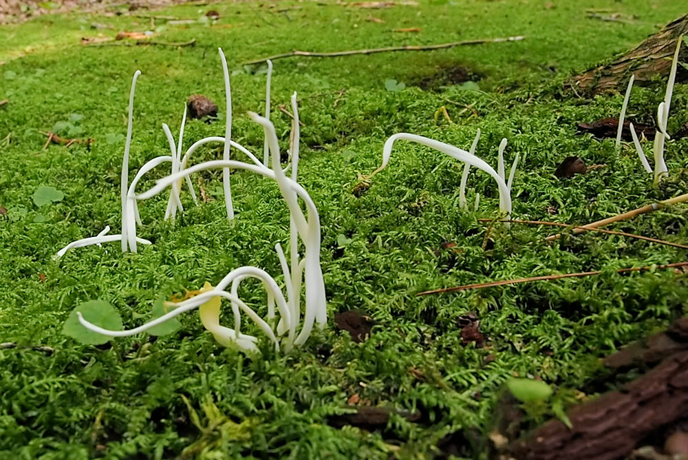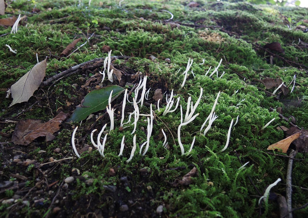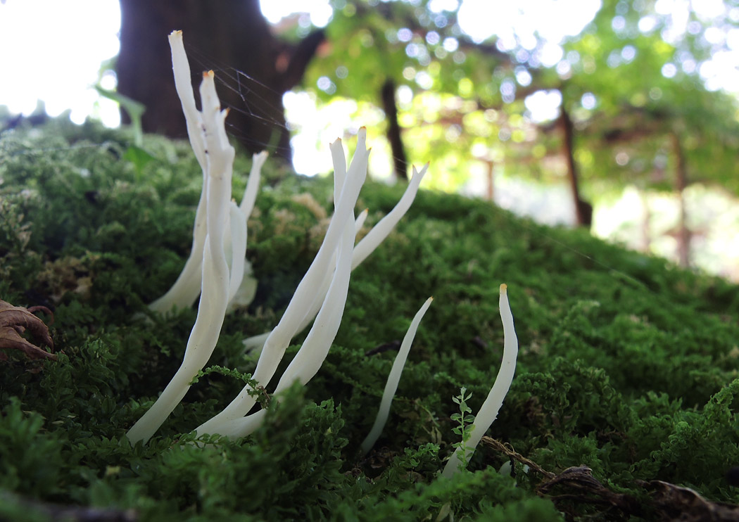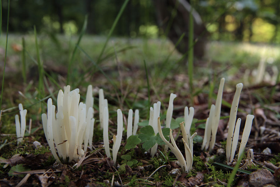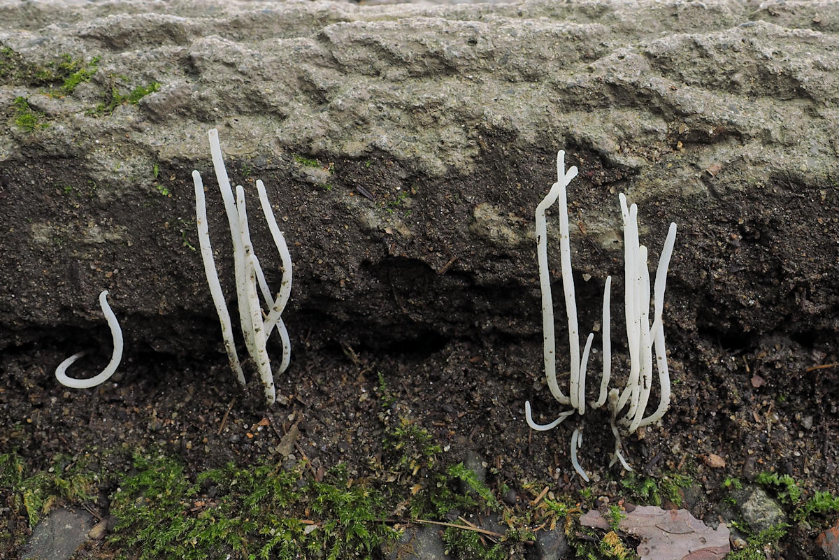 径1-3mm 高さ3.0-12.0cm 細棒状 屈曲する 先端鈍頭 基部細まり多数束生 白色→帯黄白色 平滑