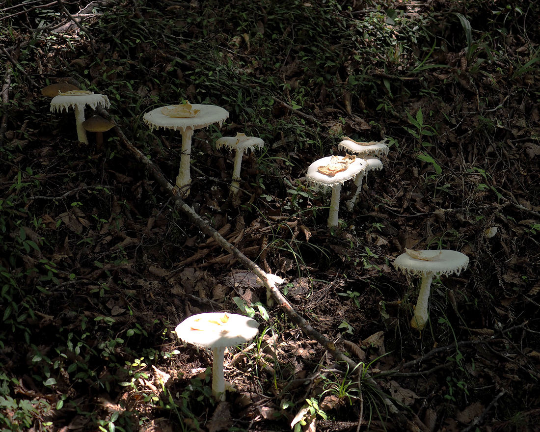 夏〜秋にアカマツ・コナラ林−シイ・カシ林−ブナ・ミズナラ林内地上に発生する